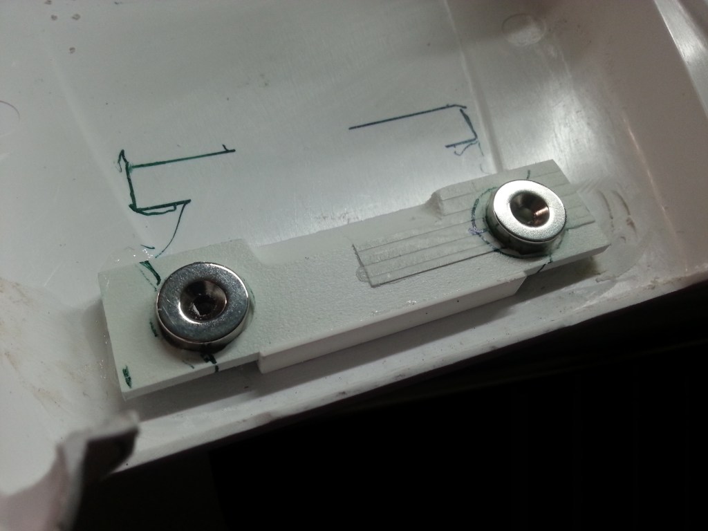 Die Magnete werden nun mit einem an die Karosserieform angepassten Bauteil, jeweils unter der Haube verklebt.