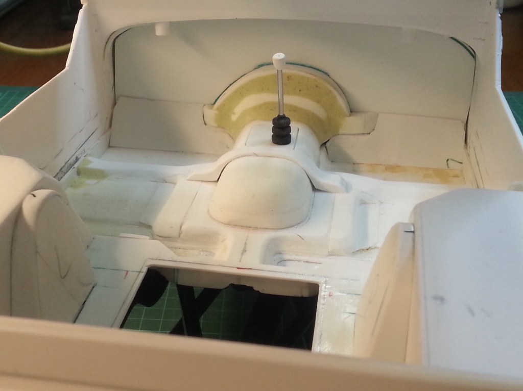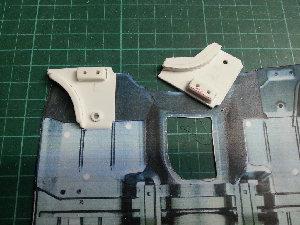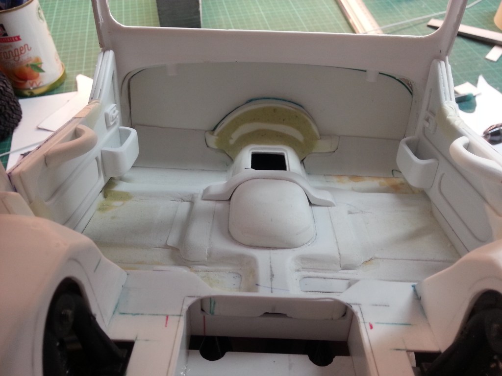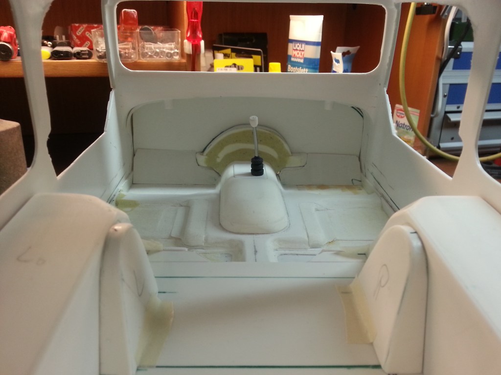 Die Verstärkungsbrücke über den Kardantunnel wurde ebenfalls verklebt und flacher geschliffen. Milliput wird die Ungenauigkeiten an den Übergängen noch kaschieren. Mein Arbeitsziel während der Feiertage!
