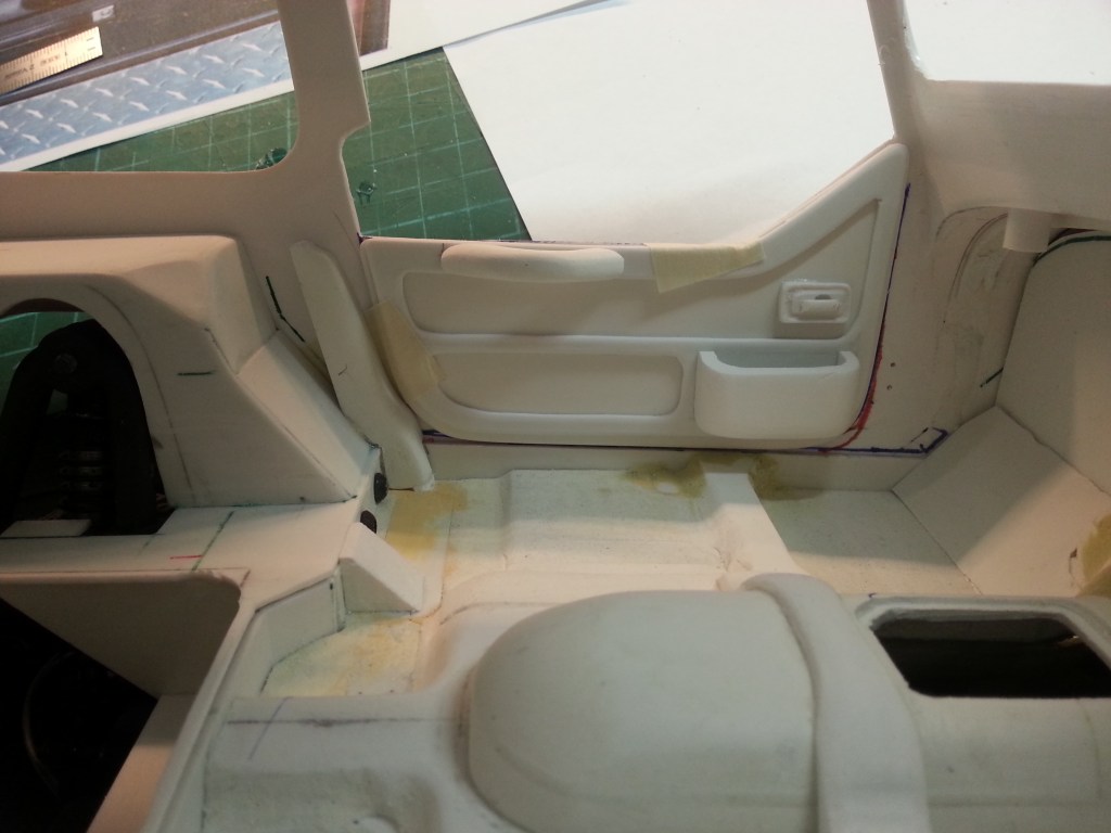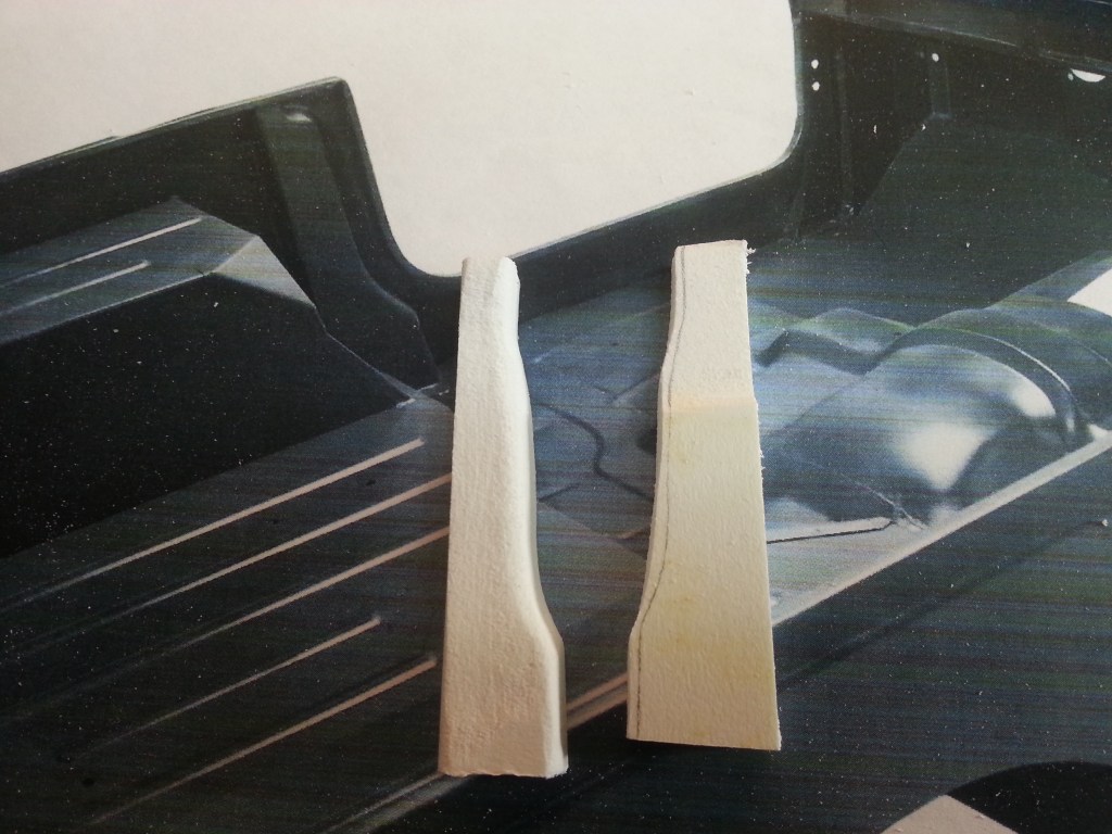 Im Vorgriff auf die beiden Türverkleidungen, habe ich zunächst ein Verstärkungsprofil gebaut. Es ist an der Seitenwand zwischen den hinteren Radkästen und den Türen montiert. An diesem Punkt, ist in der Realität auch der Überrollbügel montiert. Somit eine stark belastete Stelle. Aus Forex-Resten wurden zwei entsprechende Profile herausgearbeitet und mit der Bodengruppe verklebt.