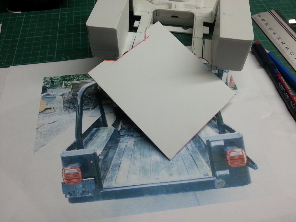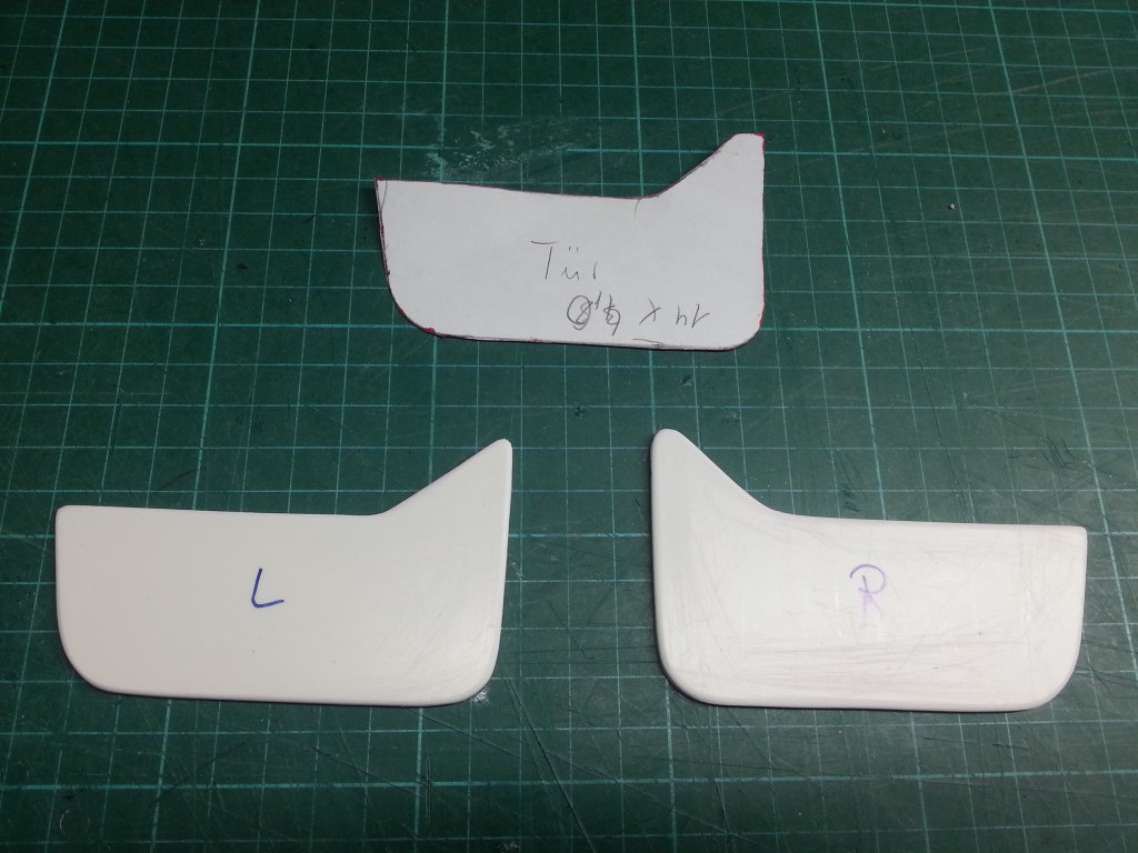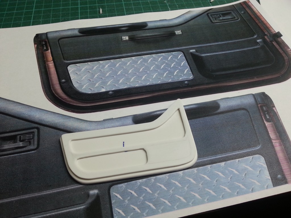 Nun zu den vorderen Türverkleidungen. Da ein reguläres Cockpit montiert wird, wollte ich auch entsprechende Türverkleidungen. Ist auch der Rest des Innenraums in Blechoptik gehalten, soll der Fahrerbereich zumindest einen Rest von Wohnlichkeit behalten. Aus Papier (oben) entstand wieder eine Vorlage für die beiden Türverkleidungen.