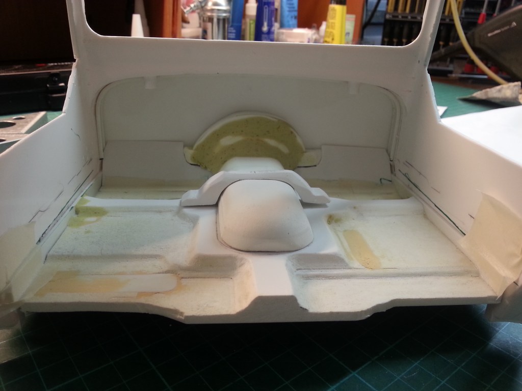 Der Innenraum erhielt weitere Optimierungen in Form von eingepassten PS-Teilen im Bodenbereich. damit wurden u.a. Unzulänglichkeiten bei der Vorarbeit kaschiert. Unter den Sitzen und im Fußraum wurden auch Blechsicken angebracht. Nachfolgend die Vorher-Nachher-Bilder.