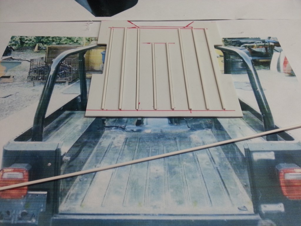 Hier also die bisher gemachten Fortschritte, beim Bau meines Wranglers. Begonnen hatte ich mit der weiteren Gestaltung des Laderaums. Dem Vorbild entsprechend, sollten der Boden und die Oberseiten der Kotflügel eine Struktur bekommen. Nach Bilder-Vorlage wurde die Anzahl Blechsicken in gleichmäßigem Abstand auf die Oberflächen aufgezeichnet. Mit einem Fräser auf dem Koordinatentisch Nuten gefräst und darin PS-Streifen 1,5 x 1,5 mm verklebt.