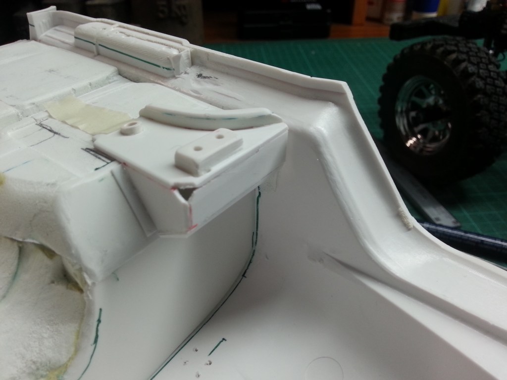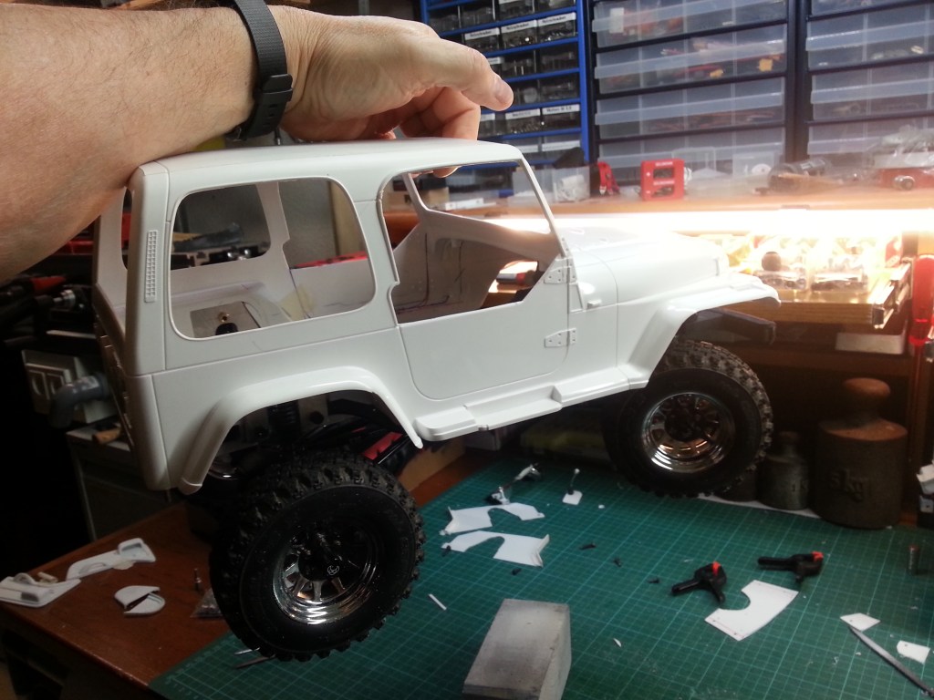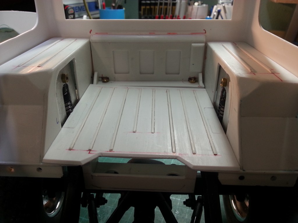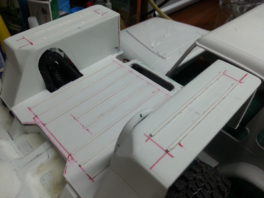 So here is the progress made so far in building my Wrangler. I started with the further design of the cargo area. According to the prototype, the floor and the upper sides of the fenders should get a structure. According to the pictures, the number of sheet metal beads was drawn on the surfaces in even distances. With a milling cutter on the coordinate table grooves were milled and PS strips 1.5 x 1.5 mm were glued into them.