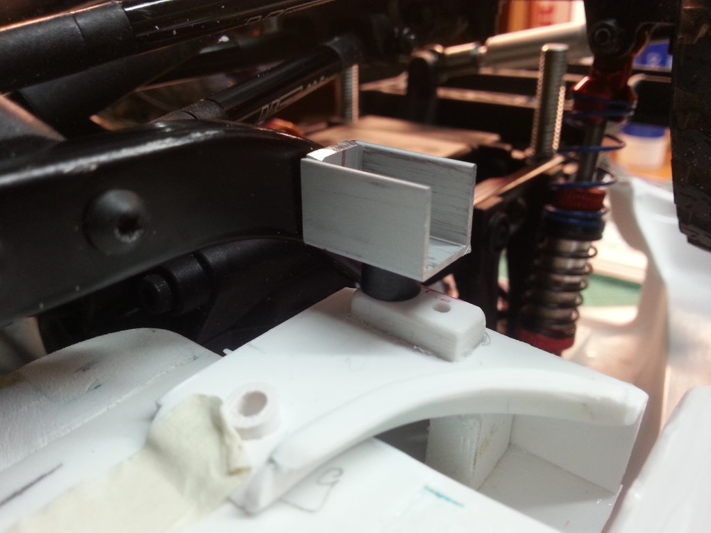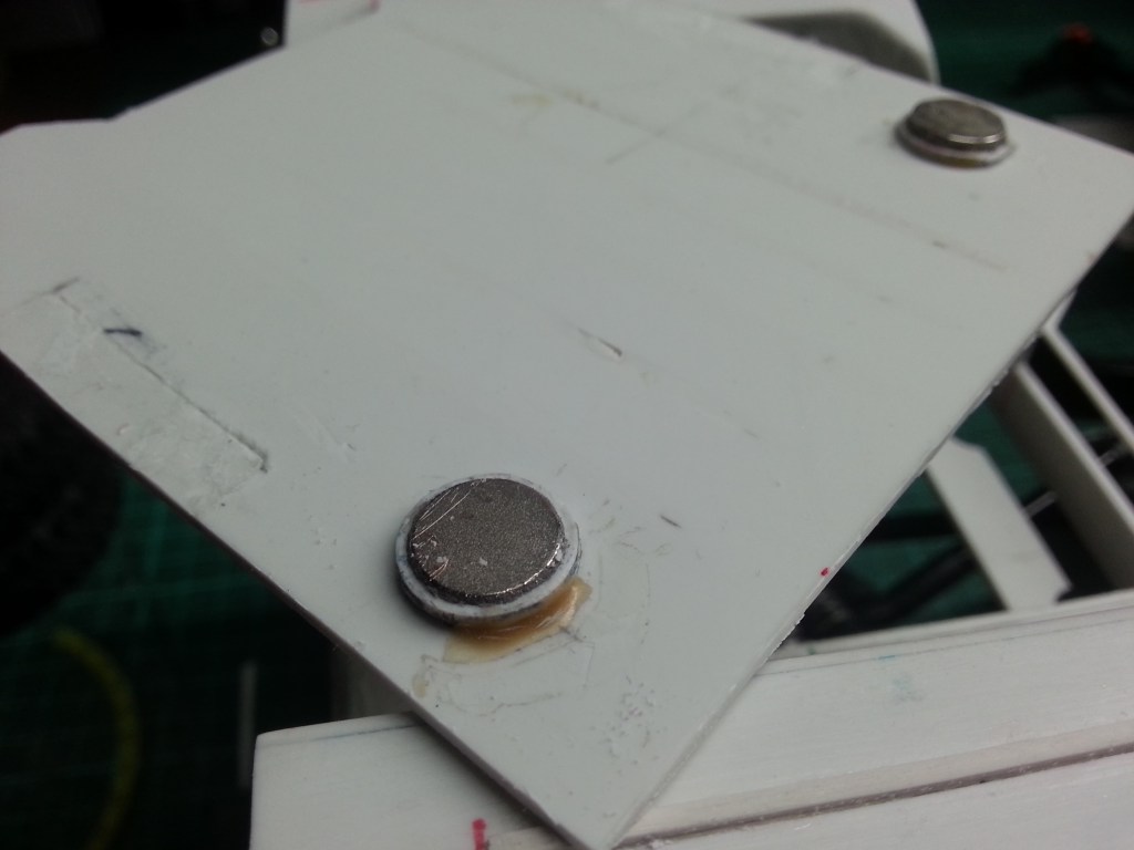 The remaining glue finally fixed the two front magnets under the hood. Manufacturer Pattex states that the 2-component adhesive should be cured after 1 hour. I waited 3 hours and the result is perfect. The chassis hangs completely under the body for the first time, held only by the 4 magnets.