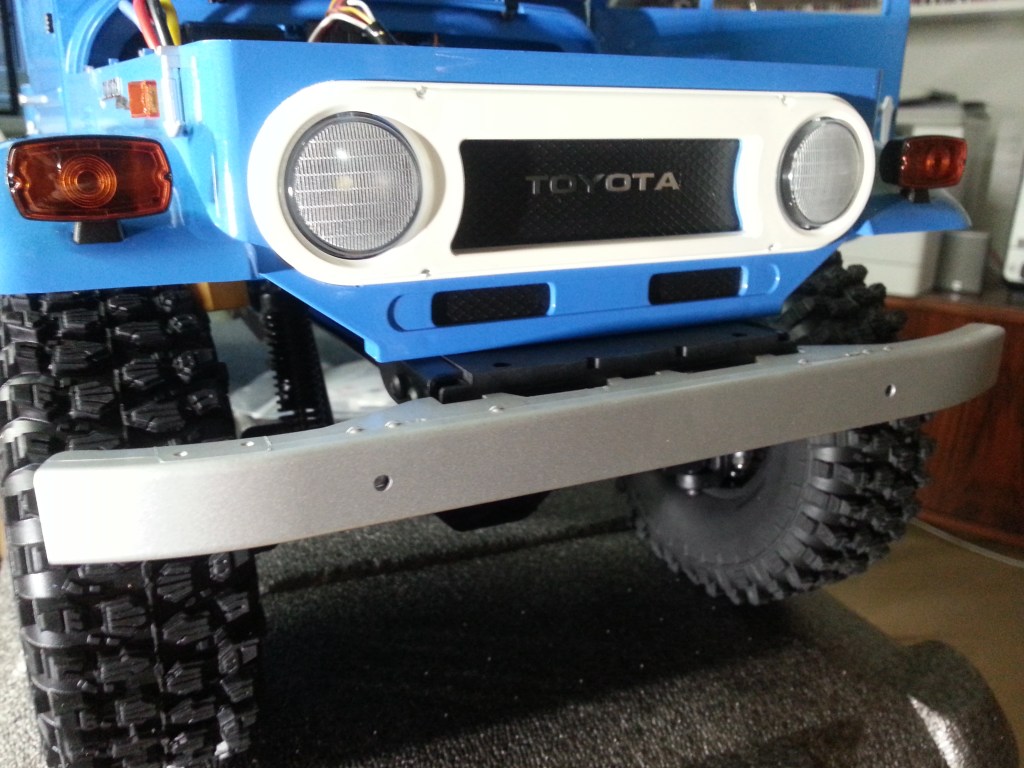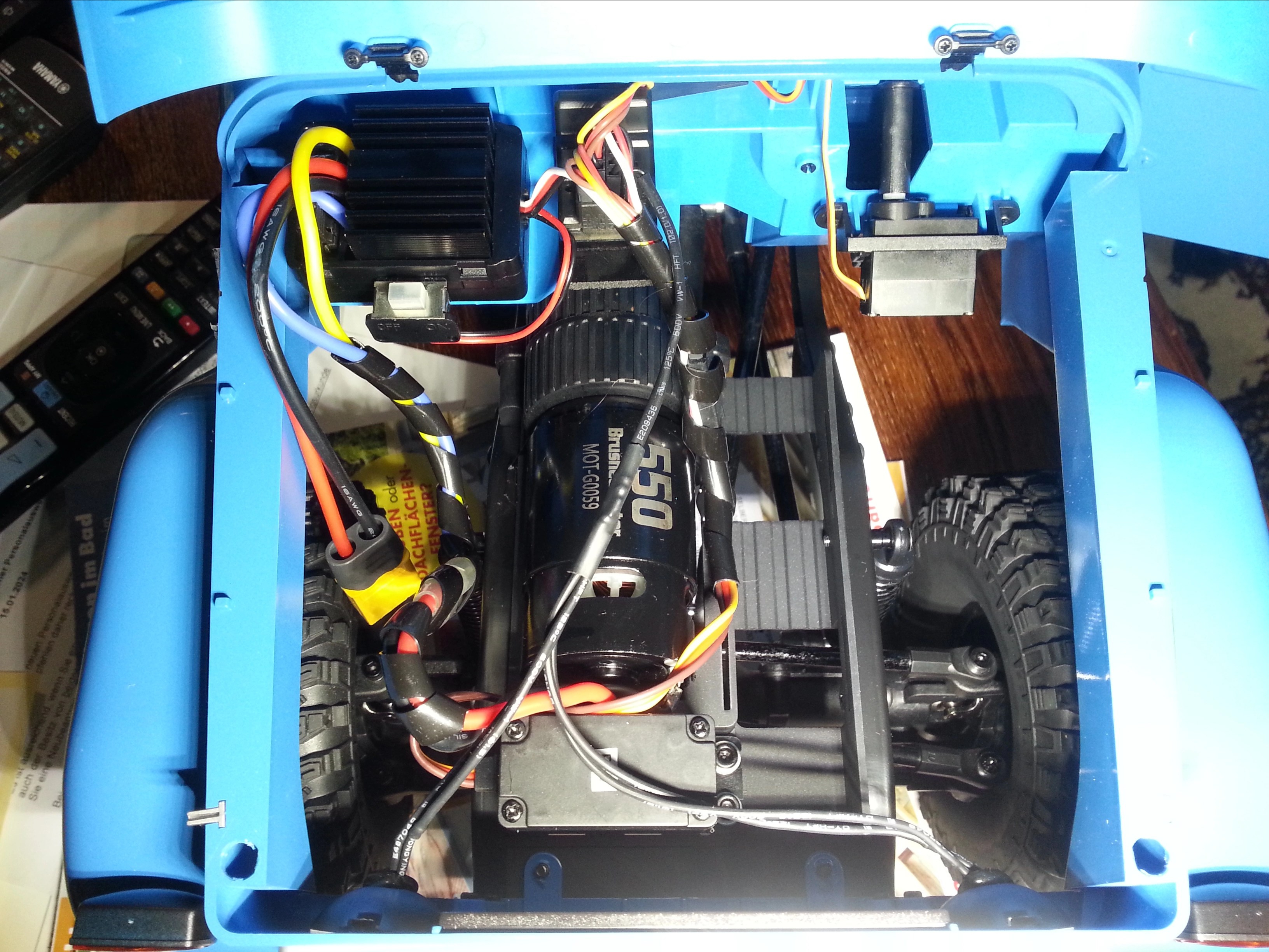 Abschließend am Kühlergriff, beidseitig weiße LEDs in den Scheinwerfergehäusen. Sie sind direkt 2-polig mit dem Empfänger verbunden, also nicht schaltbar. Sie sind somit unmittelbar nach einschalten des Fahrtreglers aktiviert. Die warmweiß leuchtenden LEDs entsprechen somit auch optisch dem Stand älterer Scheinwerferbirnen. Allerdings bleiben so Nachtfahrten ein düsteres Vergnügen und dienen höchstens als Positionslicht für die Person am Sender, sehr gewöhnungsbedürftig. Zwei freie Kanäle am Sender, ein Ein-Aus-Schalter und ein weiterer 3-Wege-Schalter, lassen aber Spielraum für u.a. den Einbau eines fernbetätigten Lichtschalters.