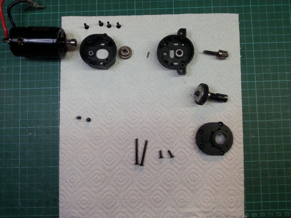 To bring out the full visual potential of the Toyota model, FMS gave it opening doors and hood. So let’s start at the front. Small, very realistic hinges have been installed on all fully movable doors. Opening the hood, which is fixed with two pins in the area of the headlights, reveals the 550 electric motor with 35T (windings) installed longitudinally at the front. It is bolted to a planetary gearbox that connects seamlessly to the motor. The motor pinion with 14 teeth meshes with two shafts arranged one above the other. The total of 4 pinions reduce the motor to a transmission ratio of 1:4.8.