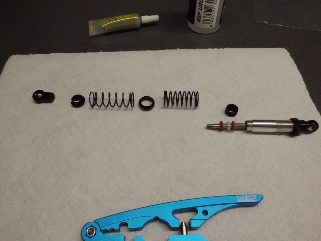 Ein TR-Dämpfer in seinen Bestandteilen. Alugehäuse, zweigeteilte Feder mit unterschiedlicher Kennlinie, Federbasis über ein Schraubgewinde einstellbar.