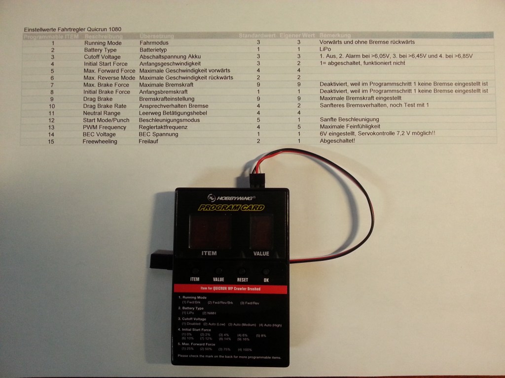 A programming card that is plugged into the speed controller. This allows 15 setting options (items) to be freely edited. In the background my currently selected configuration.