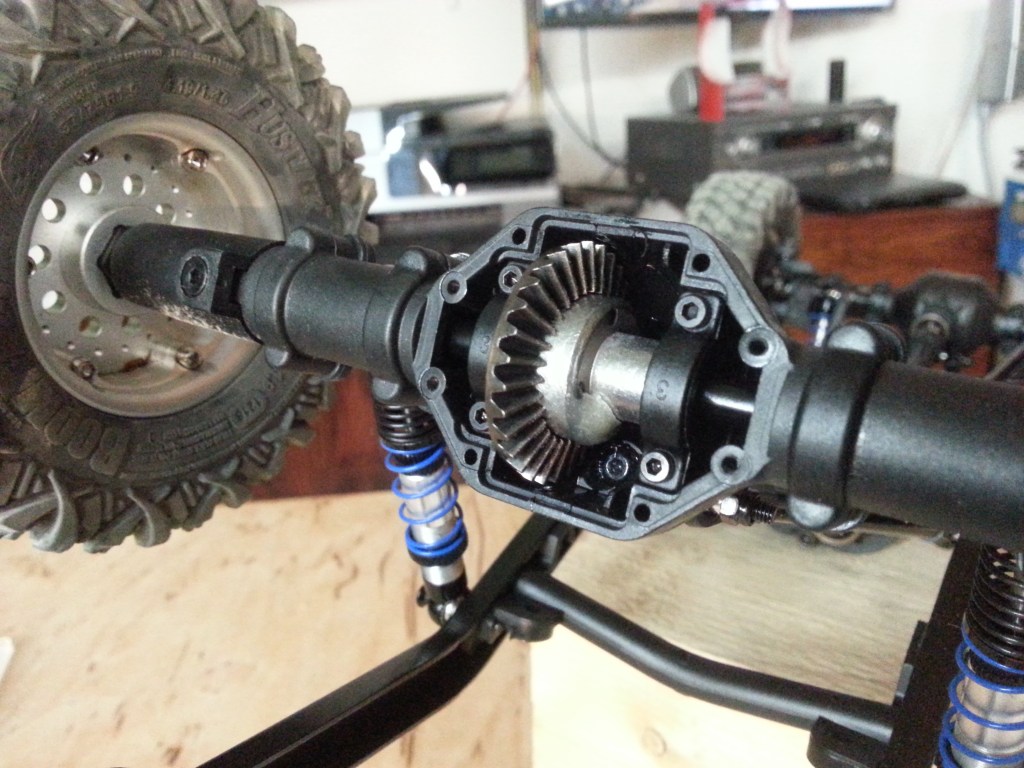 Zuerst noch etwas zu den verbauten Komponenten. Das Verteilergetriebe und die Radachsen. Zwei Wellen und je ein 14- und 30-Zähne-Ritzel, verteilen das Drehmoment auf die beiden Achsen.