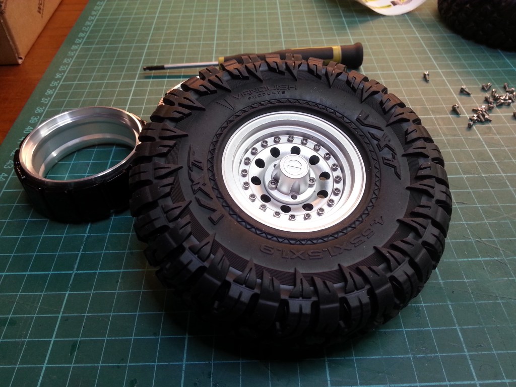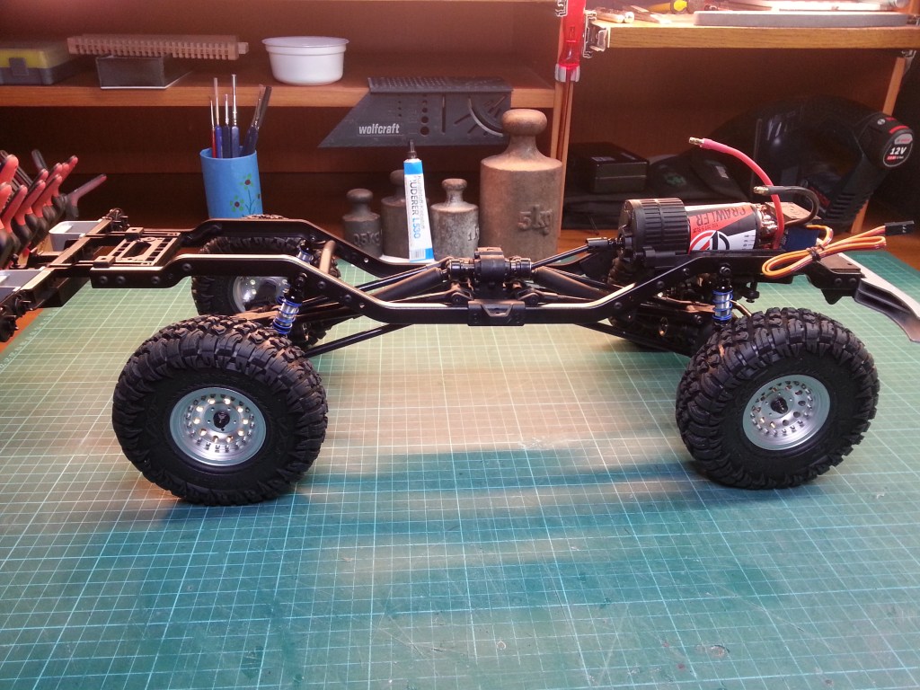 Ein neuer Reifensatz wurde ebenfalls angeschafft. Er ist auf dem Bild bereits montiert. Vanquish VXT in der Größe 4.65 x 1.5 x 1.9 waren meine Wahl. Schmäler als die bisherigen Varianten, dafür etwas größer. Exakt 118 mm im Durchmesser und 38 mm breit. Einerseits stehen die Räder nur noch hinten etwas aus dem Radkasten über und anderseits ist so die Optik insgesamt harmonischer. Bei extremer Verschränkung schleifen die Reifen auch nicht an der Karosserie. Vorne ist jetzt ein völliger Freilauf sichergestellt, lediglich hinten könnte noch geringer Kontakt an der Innenseite der Kotflügel möglich sein.