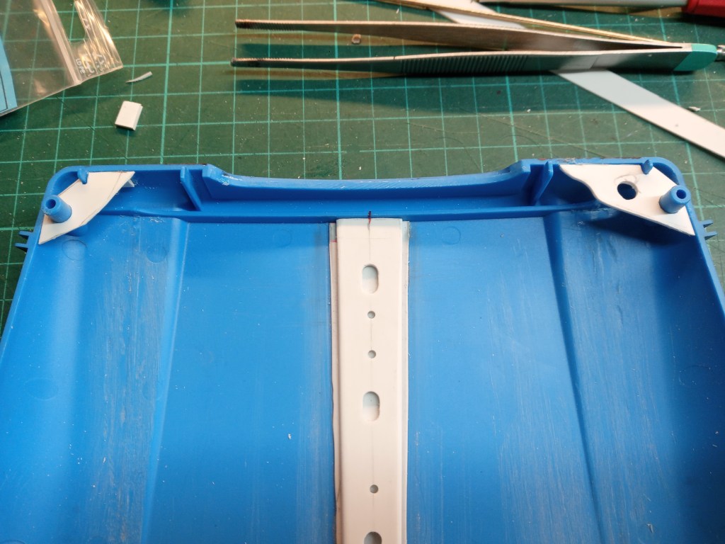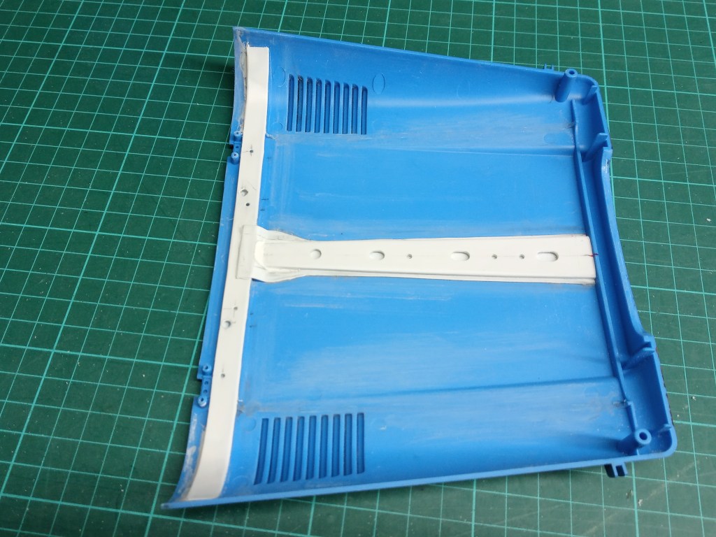 Zunächst wurden also die vorhandenen, unmaßstäblichen Strukturen herausgetrennt und beigeschliffen. Im Bereich der Scharniere dann eine Querversteifung eingezogen. Ein dünner 0,5 mm PS-Streifen, dann Richtung Kühlergrill aufgeklebt. Um das dreidimensionale Blechelement darzustellen, eine weitere Lage mit entsprechenden Aussparungen und Bohrungen aufgebracht.