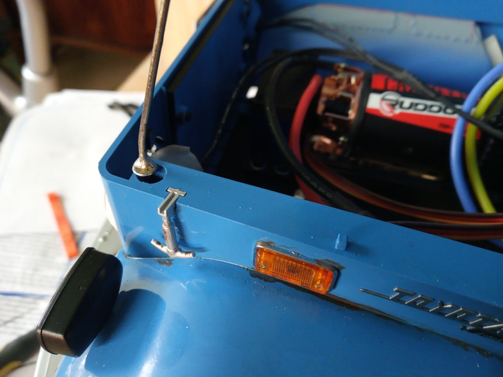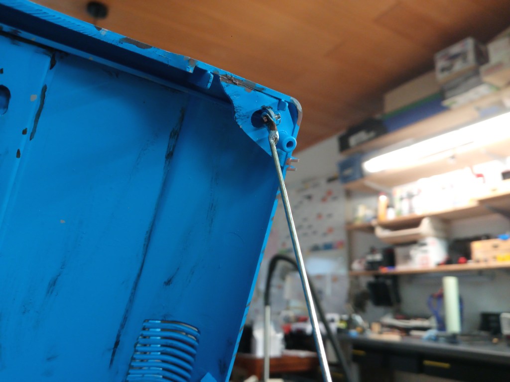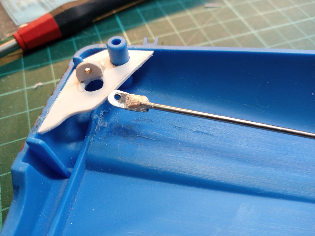 Damit das Gestänge auch bei geschlossener Haube fixiert bleibt, wurde eine Klemmvorrichtung gebaut. Ein abgewinkeltes 0,5 mm PS-Stück hält das Gestänge auf dem Lagerbock.