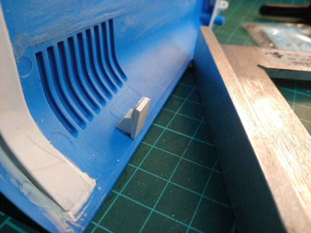 First of all, the existing, out-of-scale structures were cut out and sanded down. A transverse stiffener was then inserted in the area of the hinges. A thin 0.5 mm PS strip was then glued to the radiator grille. To create the three-dimensional sheet metal element, another layer with corresponding cut-outs and drill holes was applied.