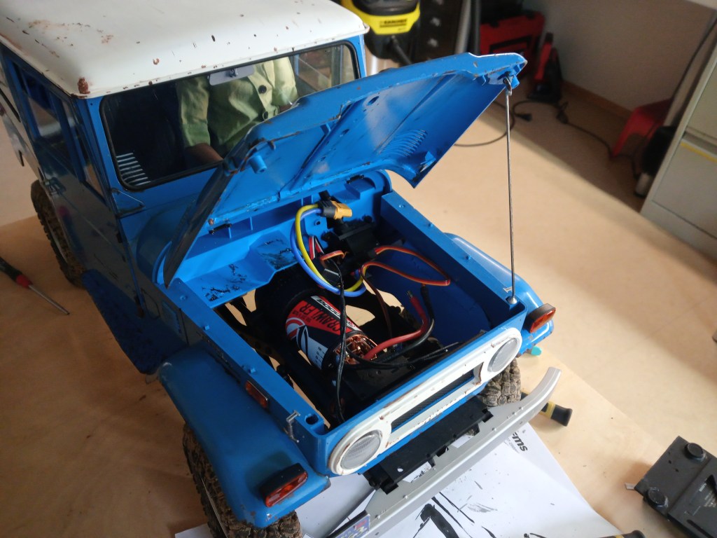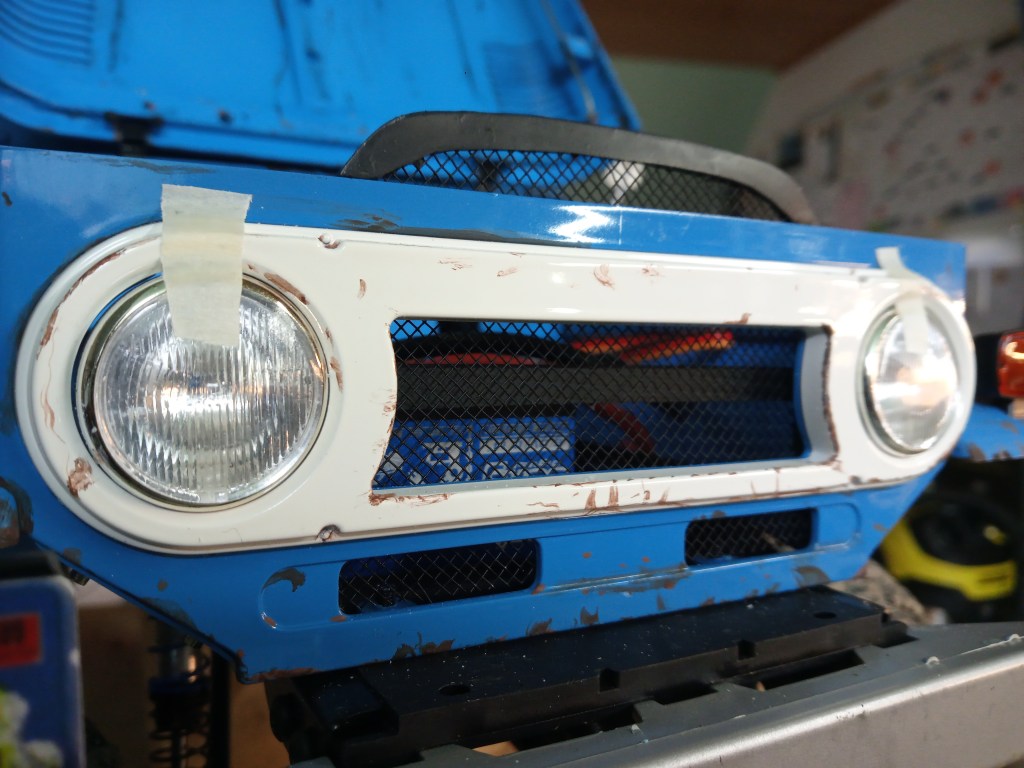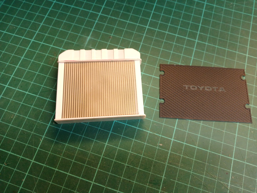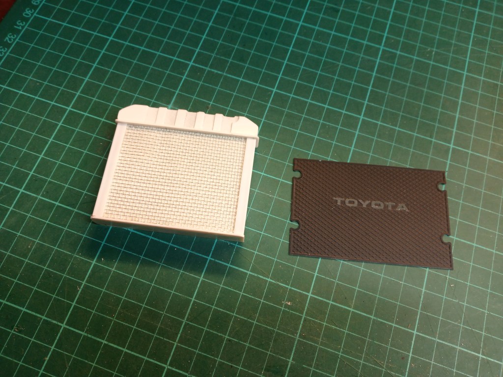 FMS hat eine ansehnliche Lösung für die Kühlermaske montiert. Eine Metallblende mit Gitteroptik und einem Metall Emblem des Toyota Schriftzuges. Das wollte ich aber noch etwas realistischer gestalten. Beim Original steht ein Hilfsrahmen mit Steinschlagschutzgitter vor dem eigentlichen Kühler.