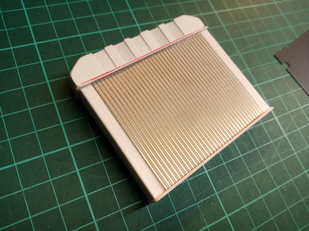 The radiator was still missing behind the grille. Below are the first components. The upper part of the radiator milled and sanded from a forex block. To the right is the dummy radiator from the kit. The finned grille is a laser-cut template with a perfectly reproduced radiator look.