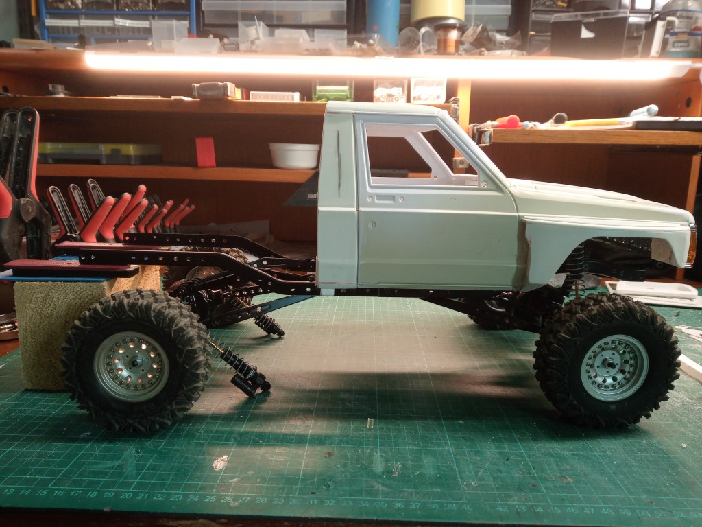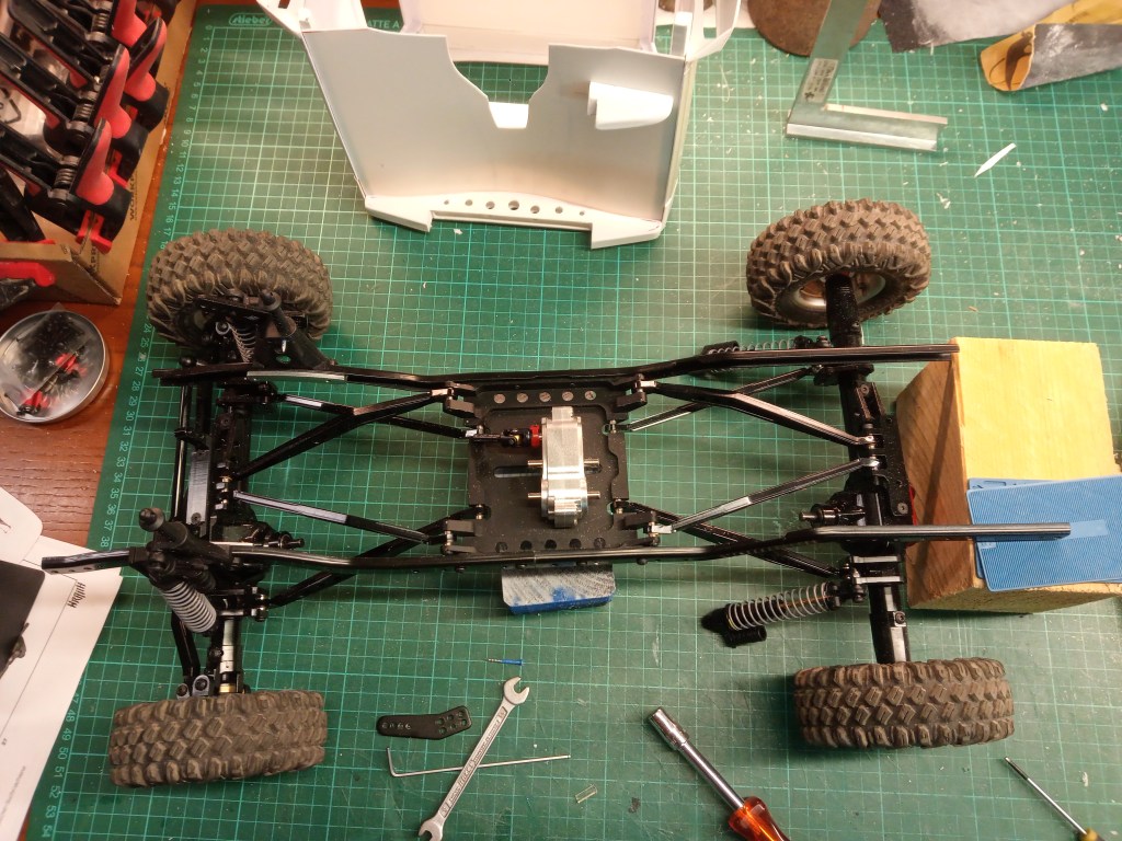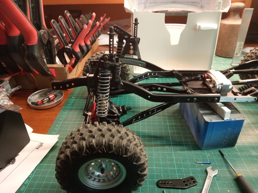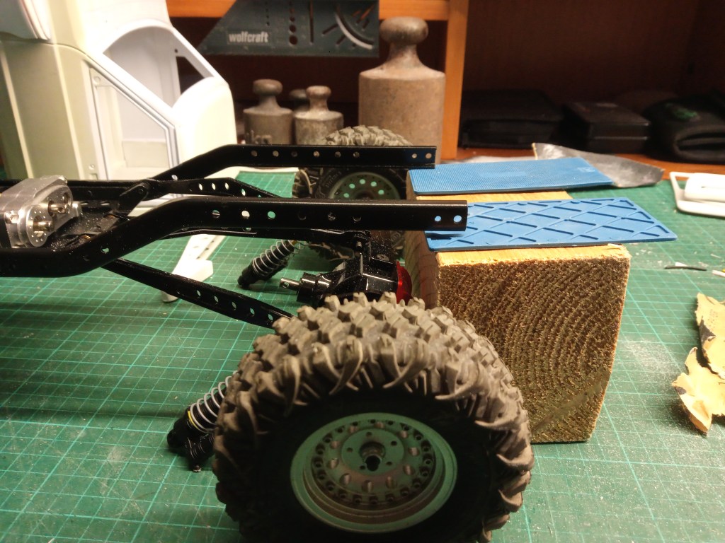 Mit lose aufgesetzter Karosserie, passen die Vorderräder in den Radkasten. Auch die Position der Dämpfer gefällt mir jetzt besser. Vorher musste ich mit einer Traverse, die zu weit hinten sitzenden Dämpferaufnahmen erreichen. So schränkt nun auch kein Rahmenteil den Bewegungsspielraum der Vorderachse mehr ein. Wer außerhalb von fertig konfektionierter Ware baut, hat halt viel zu erzählen…😊