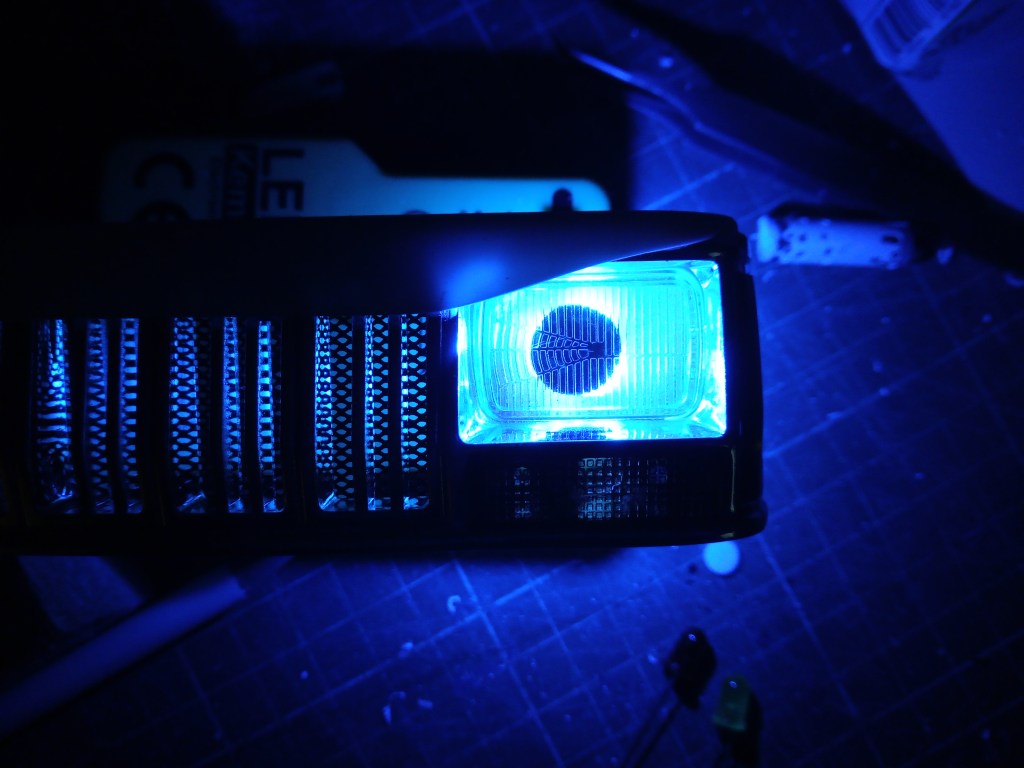 Ihr zukünftiger Platz sollte innerhalb der Front-Scheinwerfer liegen. So begann ein erster Test, Version 1 mit einer herunterskalierten Druckvorlage, wurde in den Scheinwerfern platziert. Der ursprüngliche Plan, hierfür die orangen Gläser zu nutzen wurde sofort verworfen.