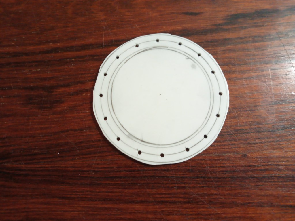 Darauf kam ein Flansch, den ich selbst anfertigte. Drei Kreise führten zum nachfolgenden Ergebnis. Für den Lochkreis habe ich aus dem Durchmesser den Umfang errechnet und durch die Anzahl der Bohrung geteilt. Diese Maß wurde dann mit einem Zirkel auf den Lochkreis übertragen und abschließend gebohrt. Mangels Lochschneidern in passender Größe, habe ich den äußeren Ring mit der Laubsäge herausgearbeitet und rund gefeilt. Feile und Laubsäge kamen auch am Innenring zum Einsatz.
