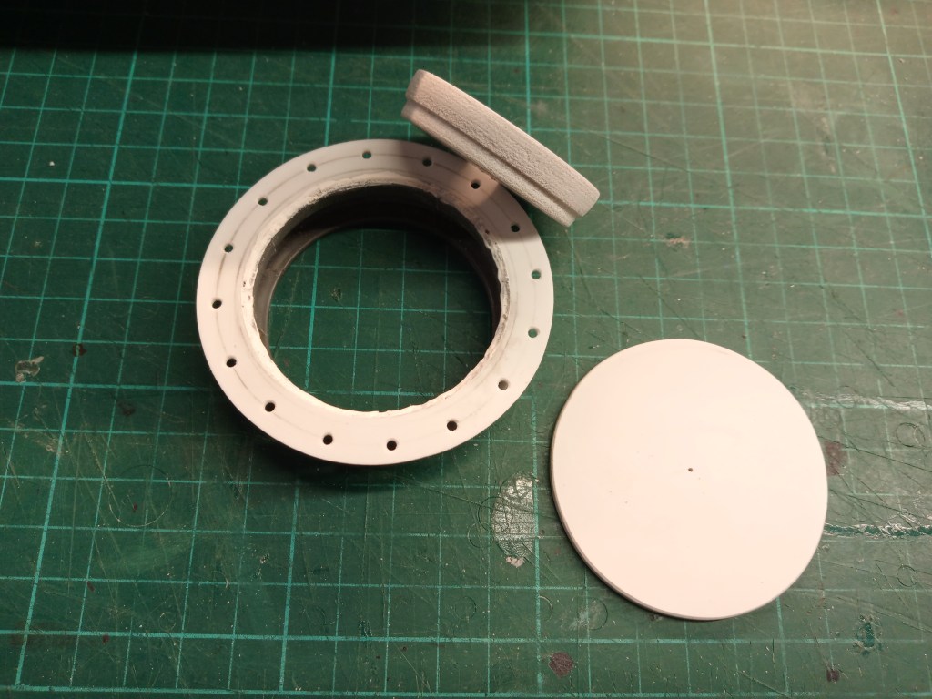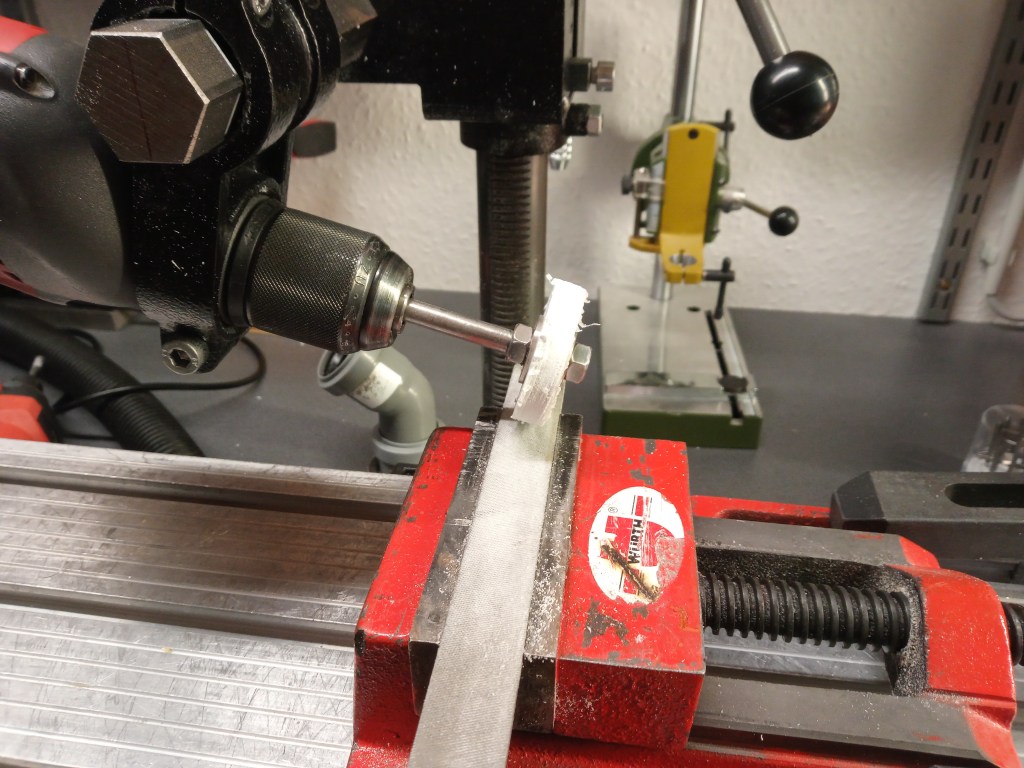 Für die eigentliche Luke musste ich wieder etwas kreativ sein. Zwar hätte ein einfacher Deckel auch genügt, hier sollte aber etwas markantes als Luke dienen. So in Richtung einer U-Boot-Luke. Daher wurde aus Forex mit dem Lochschneider ein Element ausgebohrt. Das wiederum auf einen Gewindestab geschraubt und in die Bohrmaschine eingespannt. Im ersten Schritt eine Fase herstellen…