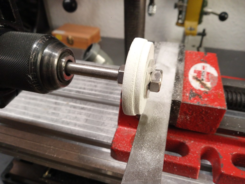… und zum Abschluss noch einen abgesetzten Rand eingeschliffen, auf der eingespannten Flachfeile im Schraubstock. Man kann also auch ohne Drehbank Konturen und einen akzeptablen Rundlauf erzielen. So das Ergebnis nach der ersten groben Schleifrunde.