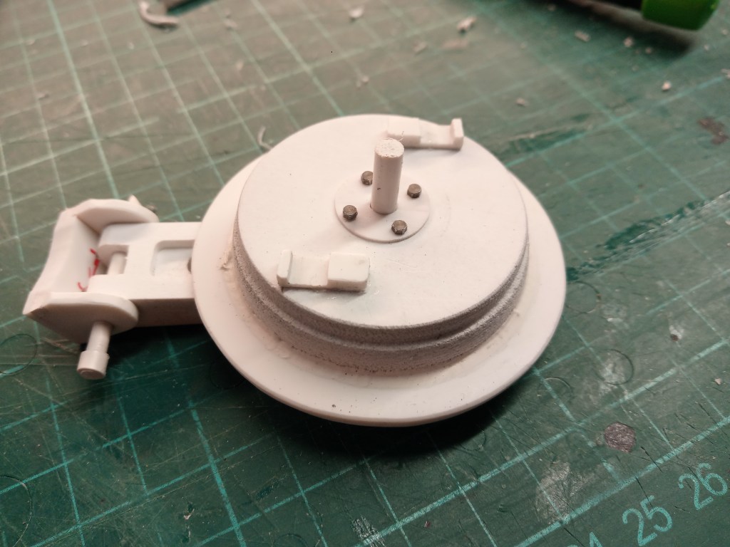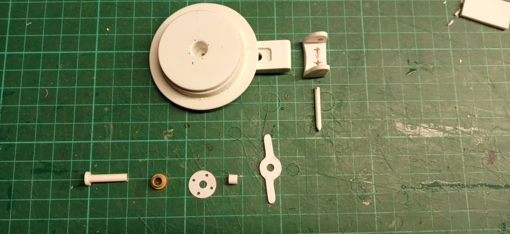 Natürlich soll ja auch alles irgendeine Funktion haben. Es gibt bereits einen Drehpunkt um die Luke aufzustellen, dann braucht es selbstredend auch Technik um es zu verriegeln. Als Lager kam eine 4 mm Tamiya-Lagerbuchse zum Einsatz. In ihr dreht sich ein Kunststoffstift mit einem oberen Rand als Auszugssicherung und Führung. Unten ein Flansch der den Bolzen unter dem Deckel fixiert. Eine weitere Hülse, wird noch durch eine U-Scheibe ersetzt, schafft Abstand zwischen Schraubenköpfen und Verriegelungslaschen.