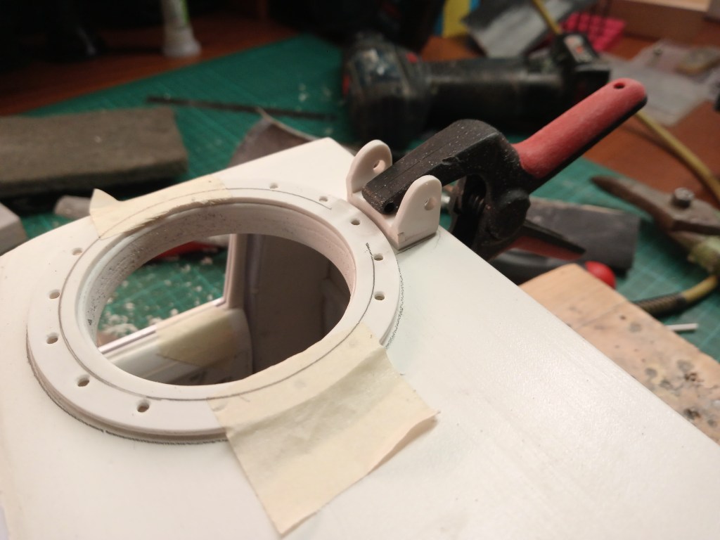 I had to be a bit creative again for the actual hatch. Although a simple cover would have sufficed, I wanted something striking to serve as the hatch. Something along the lines of a submarine hatch. Therefore, an element was drilled out of Forex with a hole cutter. This in turn was screwed onto a threaded rod and clamped in the drill. The first step was to create a chamfer…