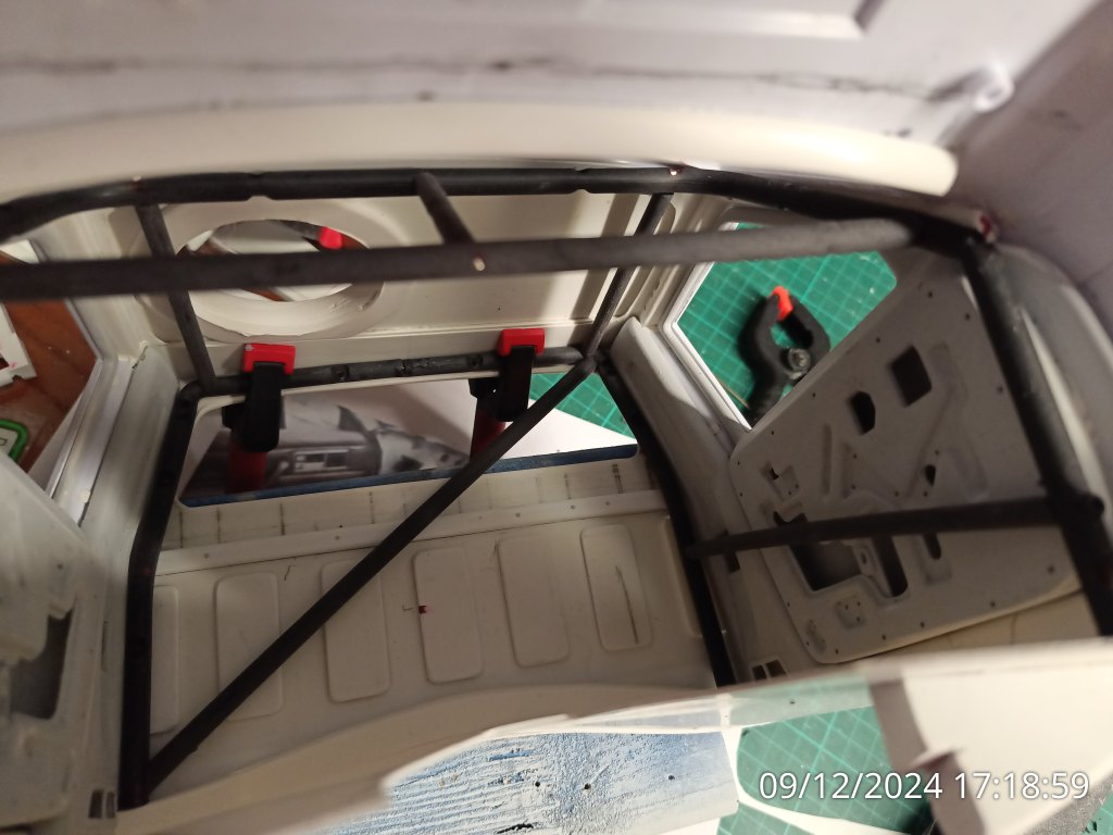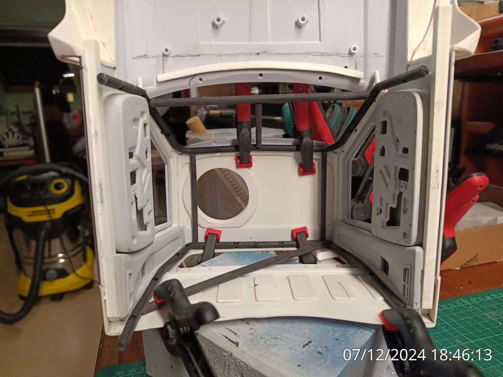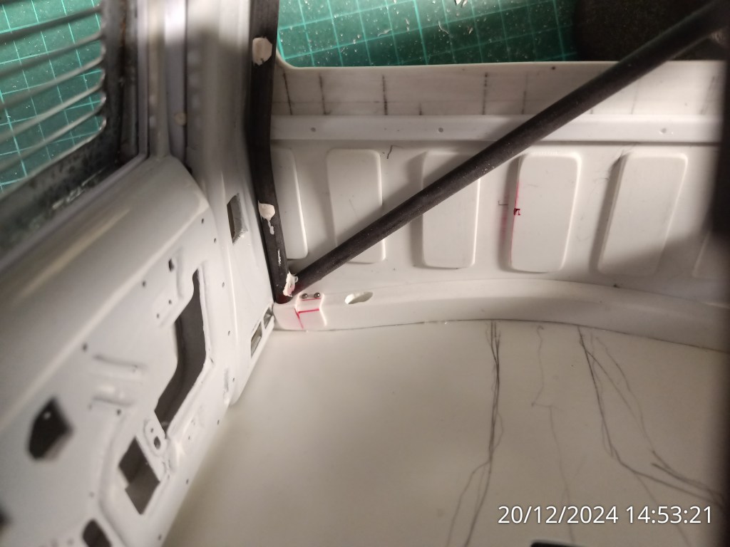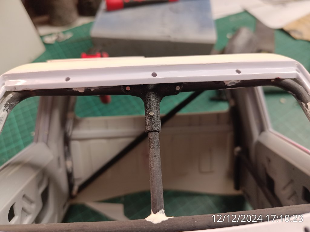 For the rear bracket, some of the molded struts were removed and sanded down. The shape of the bracket was modeled after the roof of the Toyota. It is made of resistant plastic, which is difficult to reshape even when warm. However, difficult to form does not mean that it cannot be formed at all. First of all, I cut the molded tubular element in the middle. I heated the plastic to 220 °C until it could be moved slowly and adapted to the interior contour. Finally, mark and shorten the two ends in the middle of the roof. Initial attempts at joining with 1 mm plastic pins and superglue were not suitable. The adhesive I chose did not hold and the plastic joint broke immediately under the slightest bending load.