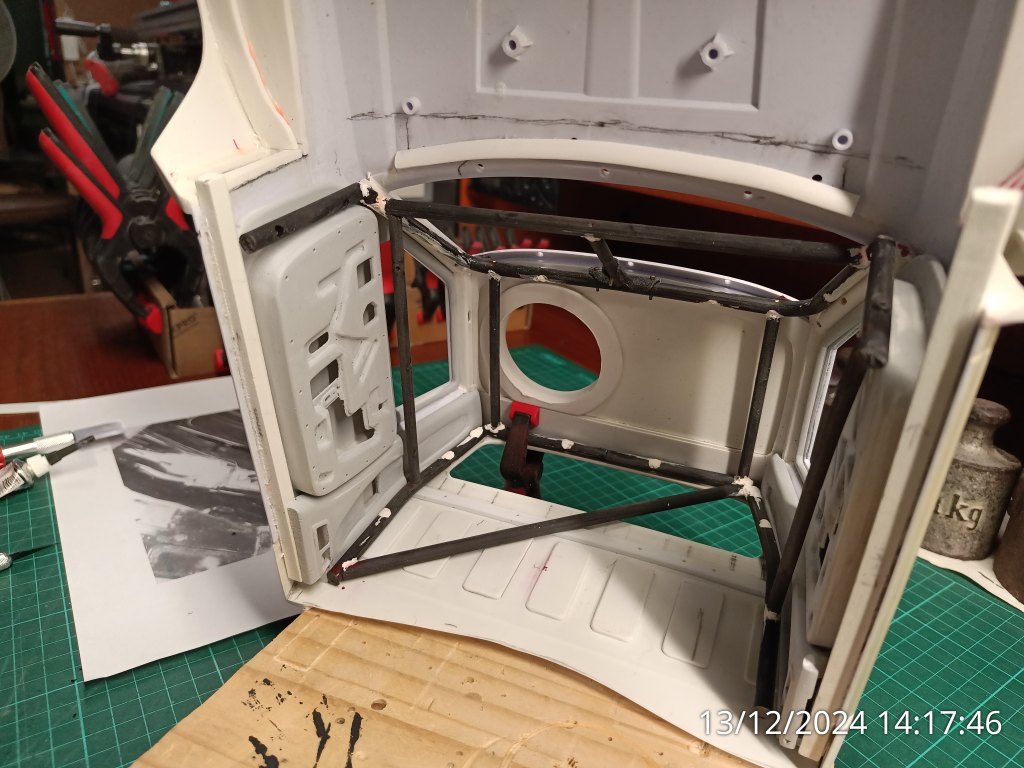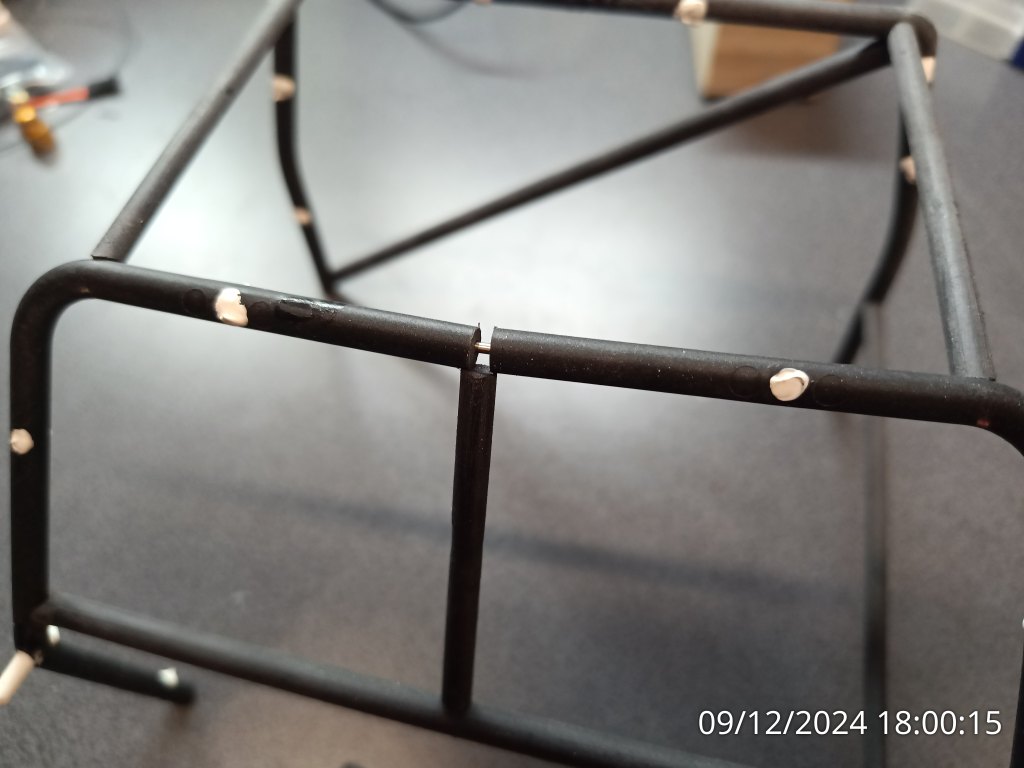 Zusätzliche Verstrebungen unter dem Dach, in der Frontscheibe und einer Diagonale auf der Rückseite des Fahrerhauses ergänzen das Gebilde zu einem Käfig. Wie schon beschrieben, alles aus den Resten des Dachgepäckträgers. Das ist auf den Fotos auch an den Bohrungen und Aussparungen teilweise noch erkennbar. An den Anbindungsstellen wurden alle Rohre mit der Rundfeile auf den Winkel und die jeweiligen Konturen angepasst.