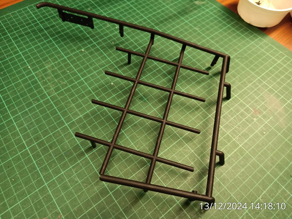 The Rat Comanche is not and will not be a combat vehicle. However, in a future that is still fictitious for us, robustness will be the guarantee for its continued existence. I also want to demonstrate this with the Comanche. To this end, it will have a roll cage in the cab. I would normally use lightweight plastic tubing in the interior. On the outside, however, I tend to use metal tubing. In this case, I chose a different variant. Not out of convenience or inability. From the construction of my last model, the FMS Toyota FJ40, a completely oversized roof rack had been lying around here for several months. It is made from two levels and bolted together.
