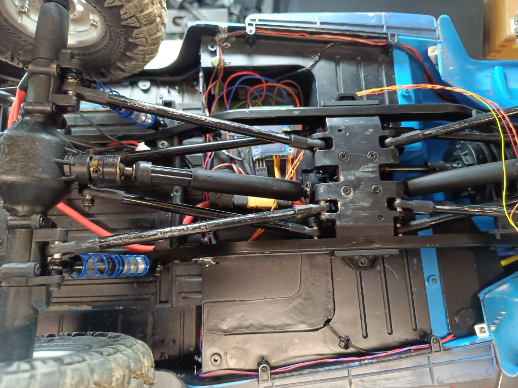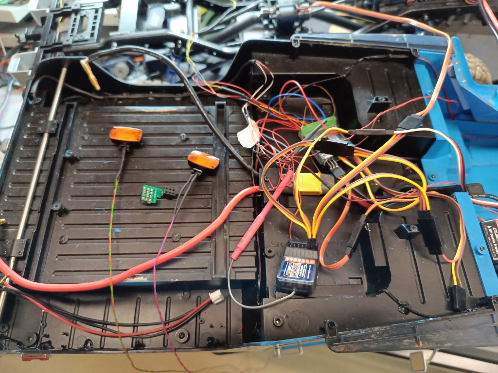 In reality so far. The rear lights in the bumper have not yet been finally connected. There are still magnetic contact points for these so that a plug does not always have to be disconnected when the body is put down. The exposed cable bundle will be soldered to this as soon as the part arrives. There is also a cover here so that no cables can be pulled out by branches and stones.