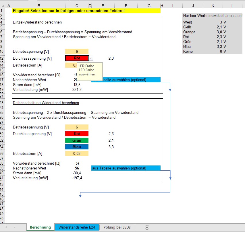 Ich will den grundsätzlichen Aufbau einmal verdeutlichen. LEDs haben ein langes Beinchen, die Anode, oder auch mit + bezeichnet. Der zweite, kürzere Kontakt ist die Kathode, folgerichtig mit dem Vorzeichen – versehen. Leuchtdioden haben in Abhängigkeit der dargestellten Farbe eine unterschiedliche Spannung von 2,1-3 Volt. In RC-Fahrzeugen liegen Spannungen von 6 Volt aufwärts an, also deutlich mehr, als eine Leuchtdiode vertragen würde. Somit muss in jedem Fall ein Widerstand vorgeschaltet werden. Im Internet sind Rechner zu finden, die in Abhängigkeit von Vorspannung und Durchlassspannung, also der Farbe) die korrekten Widerstandswerte berechnen.