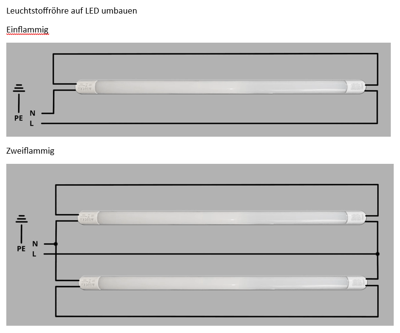 Wherever work is done, there must also be light. A defective double-flame fluorescent tube was quickly converted to LED technology. The control unit was defective anyway and therefore a suitable candidate, instead of buying a new one and disposing of the old light.
