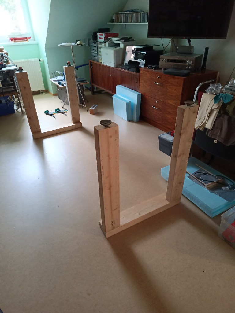 Daher hatte ich erst einmal die Bestände in meinem Materialfundus gesichtet. Schon einige Jahre lag da versteckt in der hintersten Ecke eine Arbeitsplatte, aus der Auflösung einer Computer-Werkstatt. Zwei weitere habe ich bereits in der Nutzung. Eine stationär und eine zweite auf Rollen, um die Arbeitsstelle flexibel zu gestalten. Das fand ich auch für meine Werkstatt eine gute Lösung. Nur die Arbeitshöhe sollte vom Standard abweichen. Rückenschonend im Stehen zu arbeiten war mein Ziel. Ein normaler Unterbau scheidet also aus.