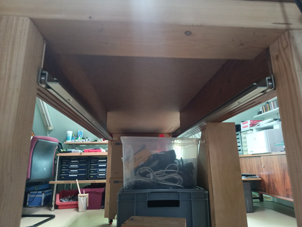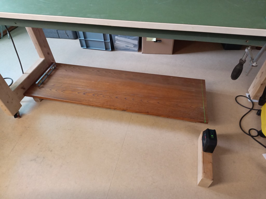 So I started by looking through the stock in my material pool. Hidden away in the far corner was a worktop that had been left over from the closure of a computer workshop. I already have two others in use. One is stationary and the other is on casters to make the workspace flexible. I thought this would be a good solution for my workshop as well. Only the working height should deviate from the standard. My goal was to be able to work standing up without straining my back. A normal base was therefore out of the question.