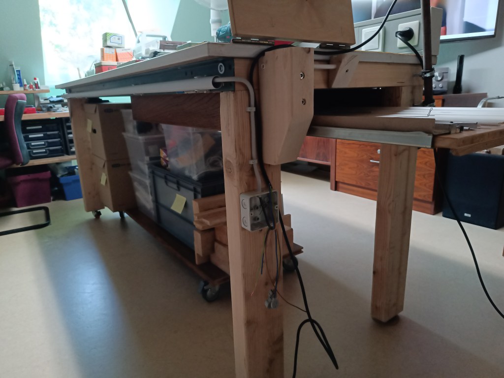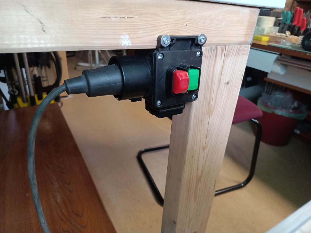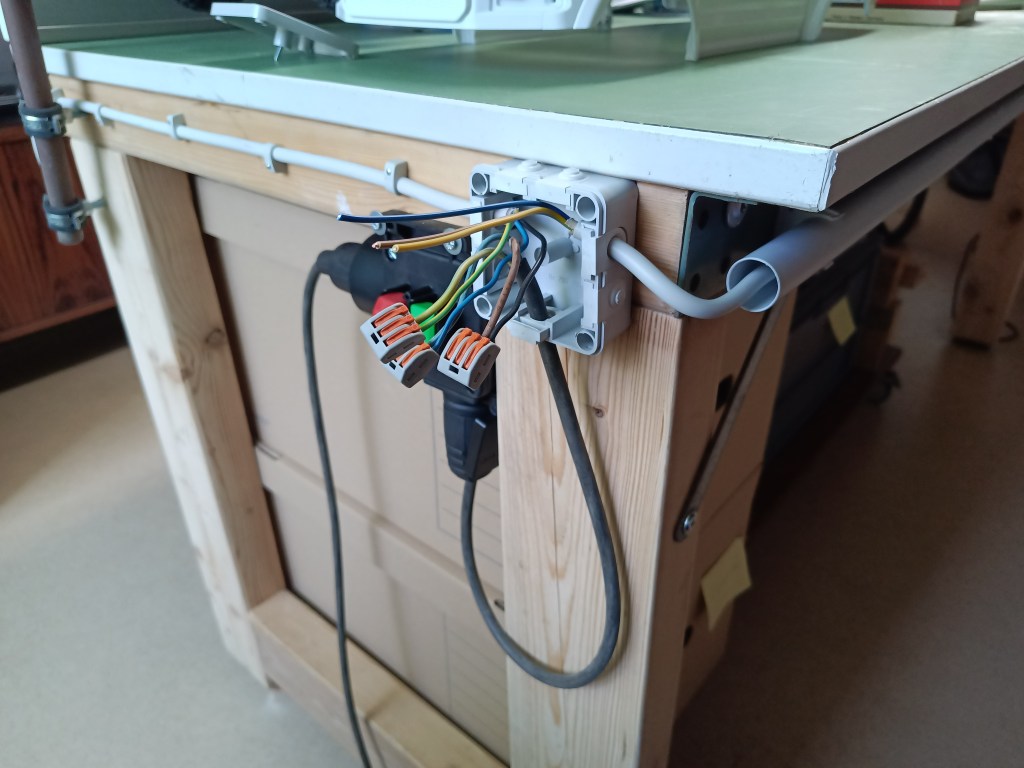 A few more details. At the moment, the electrical system is not yet completely finished. It was routed in the empty conduit from the power supply to the right in front of the table. There, another socket is connected in a junction box, to which the jigsaw is plugged in. An intermediate foot switch will then switch the machine on and off as required.