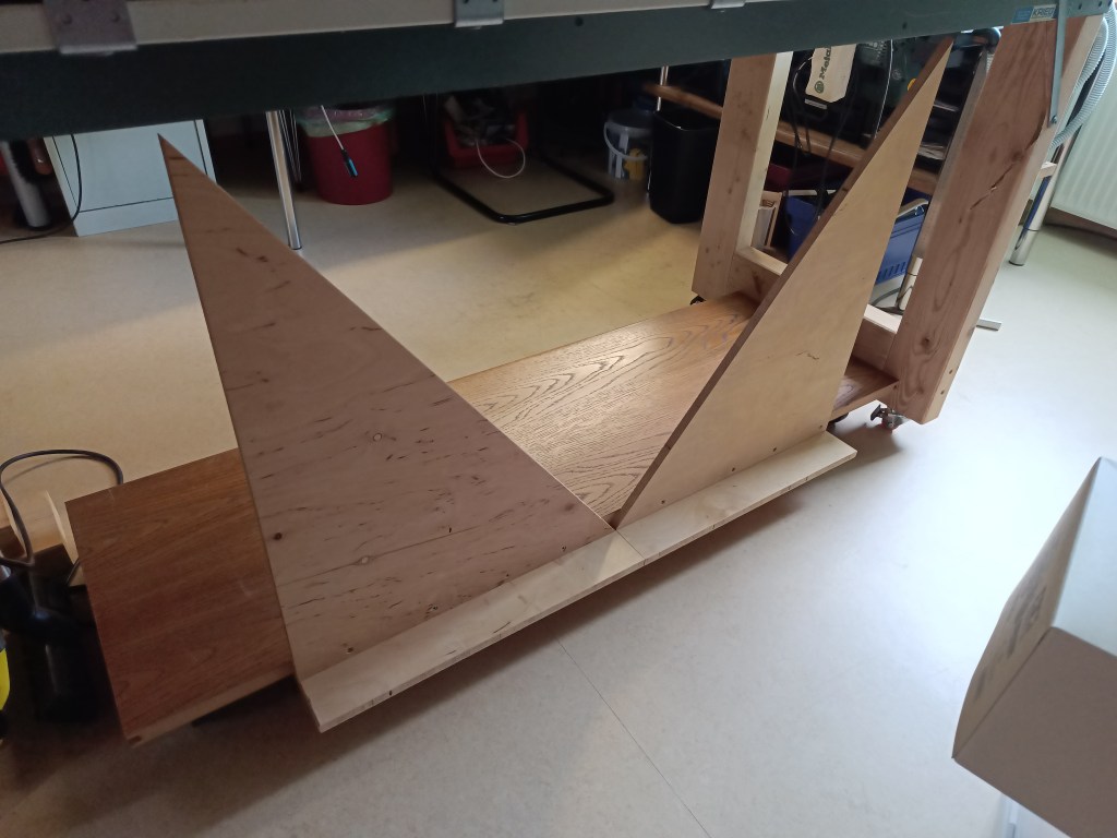 Two 950 mm long under-table pull-outs, two solid pieces of wood, and the bottom of a disused cabinet were used.