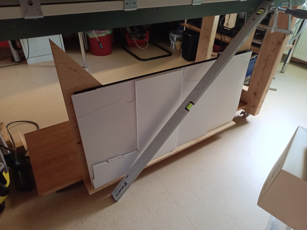 An der Rückseite gab es noch eine Ablage auf dem unteren Rollbrett. Darauf stehen jetzt alle meine Kunststoffplatten. Ein diagonal gesägtes Rechteckbrett, ein ehemaliger Schrankboden, verhindern das die Platten nach vorne umfallen. Die Wasserwaage wird noch durch ein am oberen Rahmen verschraubtes Holzkreuz ersetzt, um auch das Umkippen nach hinten zu vermeiden. Dazu kam ich bisher aber noch nicht.