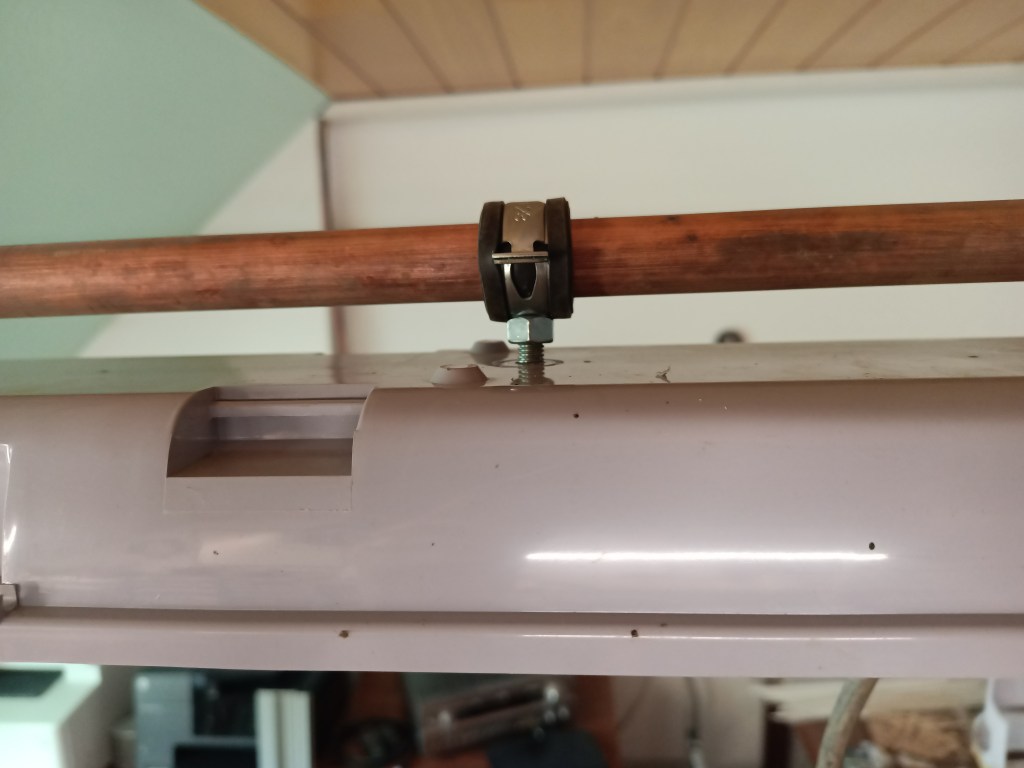 Die Leuchte an sich hängt an drei Cu-Rohren 22 mm, die mit je 2 Schraubschellen auf beiden Seiten verschraubt sind. Leicht versetzt, um das Zentrum der Leuchte über der Mitte der Arbeitsfläche zu positionieren.