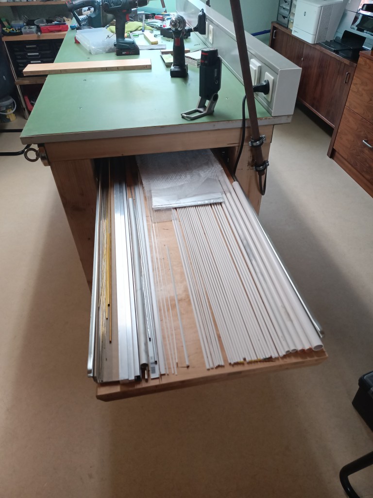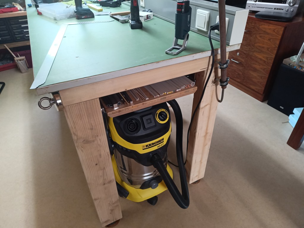 Ein fast komplett ausziehbarer Auszug nimmt so alle meine Kunststoff- und Metallprofile auf und lässt sie auch unter dem Tisch verschwinden. Darunter der Staubsauger.