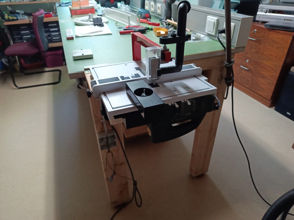 As a preliminary conclusion, I needed to find a new place for my jigsaw and the saw table from Neutechnik. Normally, the saw table is attached directly to the table using the screw clamp supplied. However, this would have interfered with my setup. The jigsaw, which is mounted underneath the saw table, would block the pull-out described above.