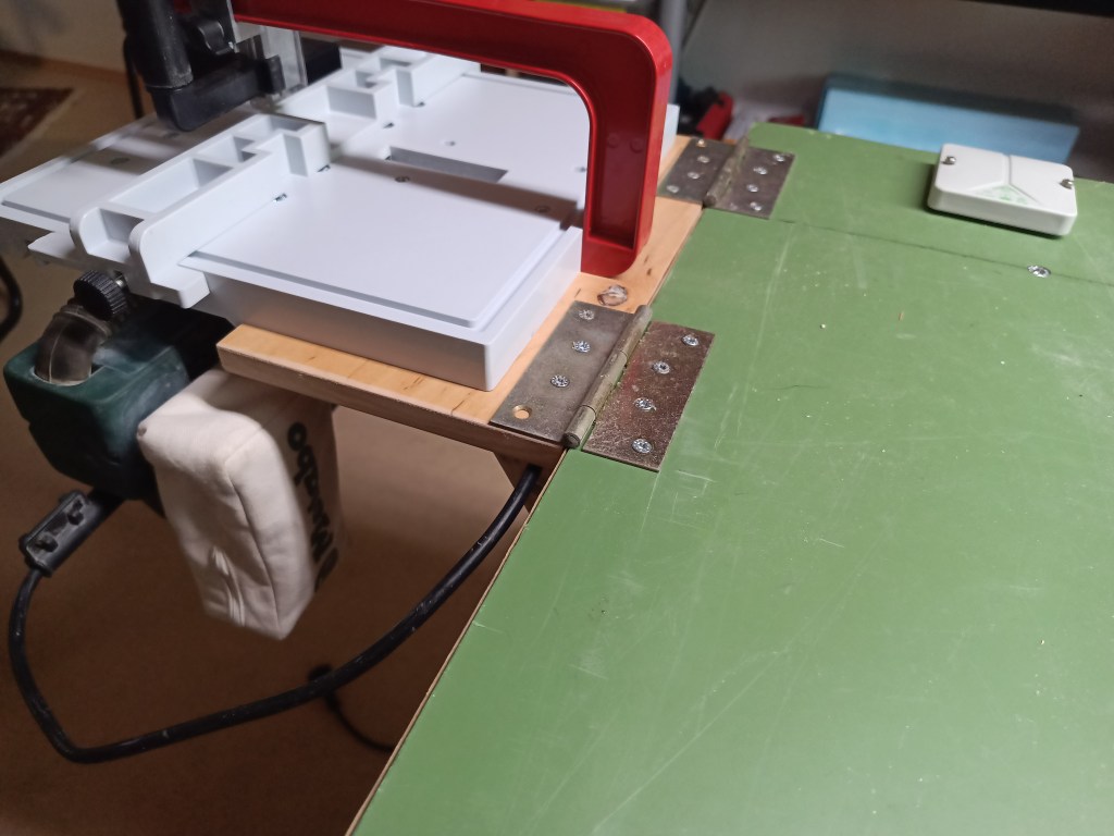 Meine Lösung; ein zusätzliches Brett um den Sägetisch mit Abstand zu montieren und zwei Scharniere um alles bei Bedarf hochzuklappen.