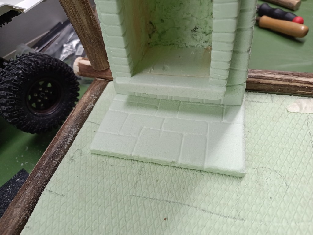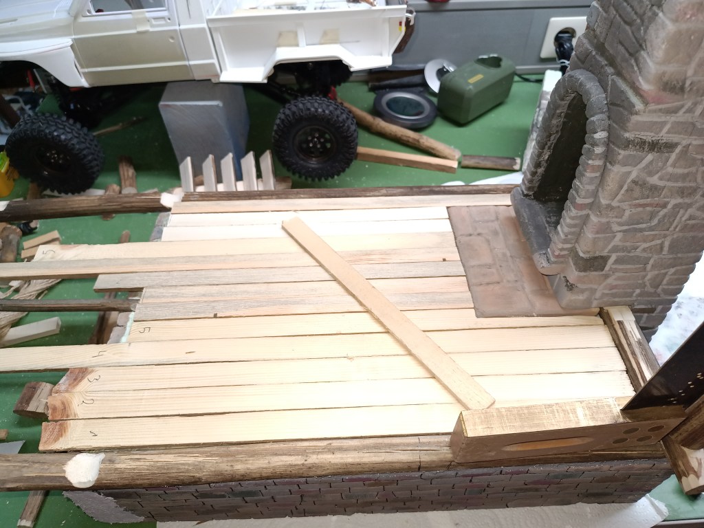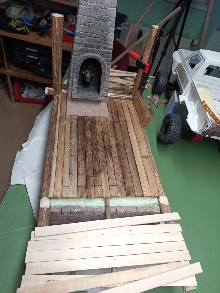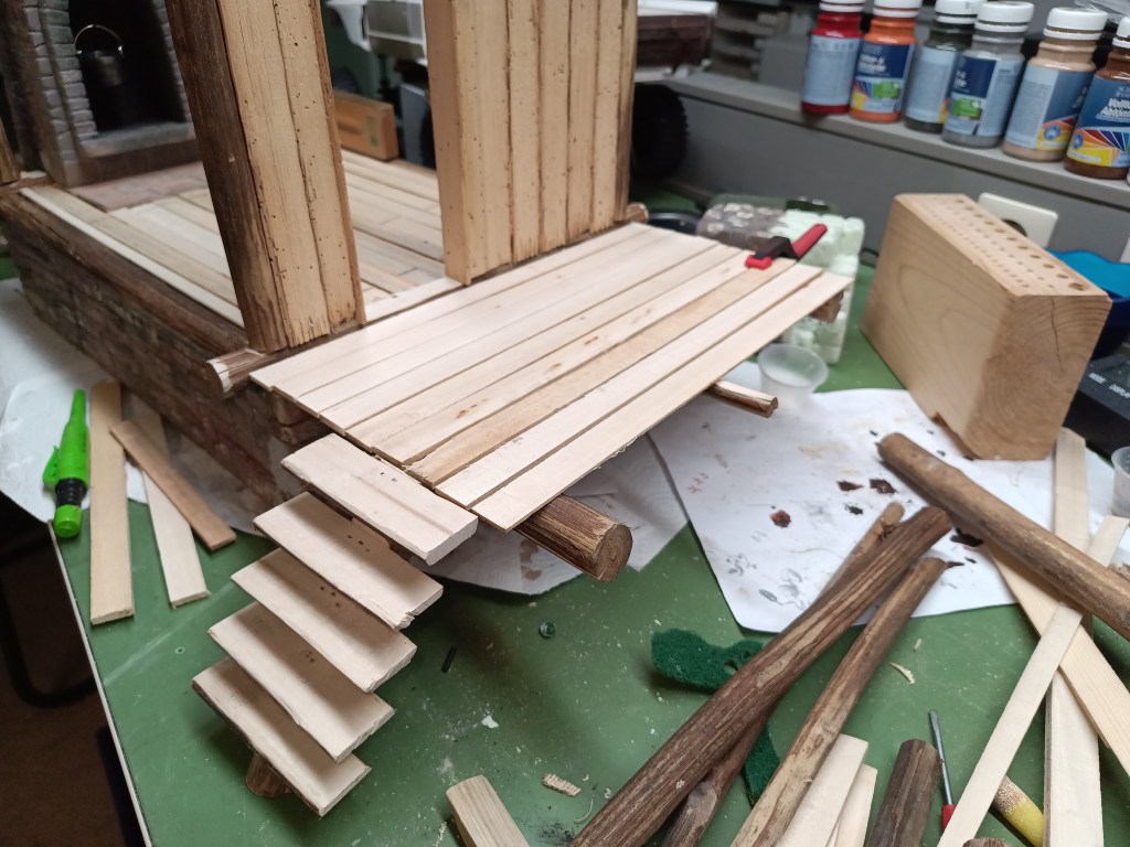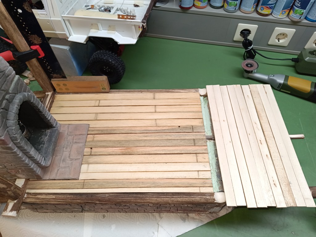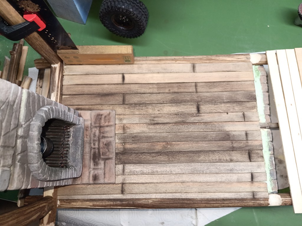 Daran wurde weiter optimiert. Die Stoßkanten der Bretter geschwärzt und punktuell Flächen aufgehellt und andere noch weiter abgedunkelt. Im Zuge der Bodengestaltung wurde auch das bisher einteilige Steinfundament zerschnitten, verklebt und ausgefugt.