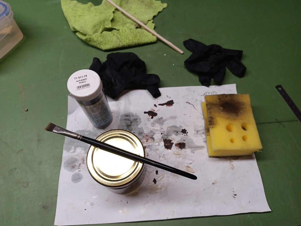 Ein zweiter Anstrich verdichtete die Partikel und die Richtung stimmte. Um die Malerzeit nicht beliebig auszudehnen, wurde zu einem rabiateren Mittel gegriffen. Ein wenig schwarze Farbpigmente in einem Küchenschwamm verteilt, ergaben dann das gewünschte Ergebnis.