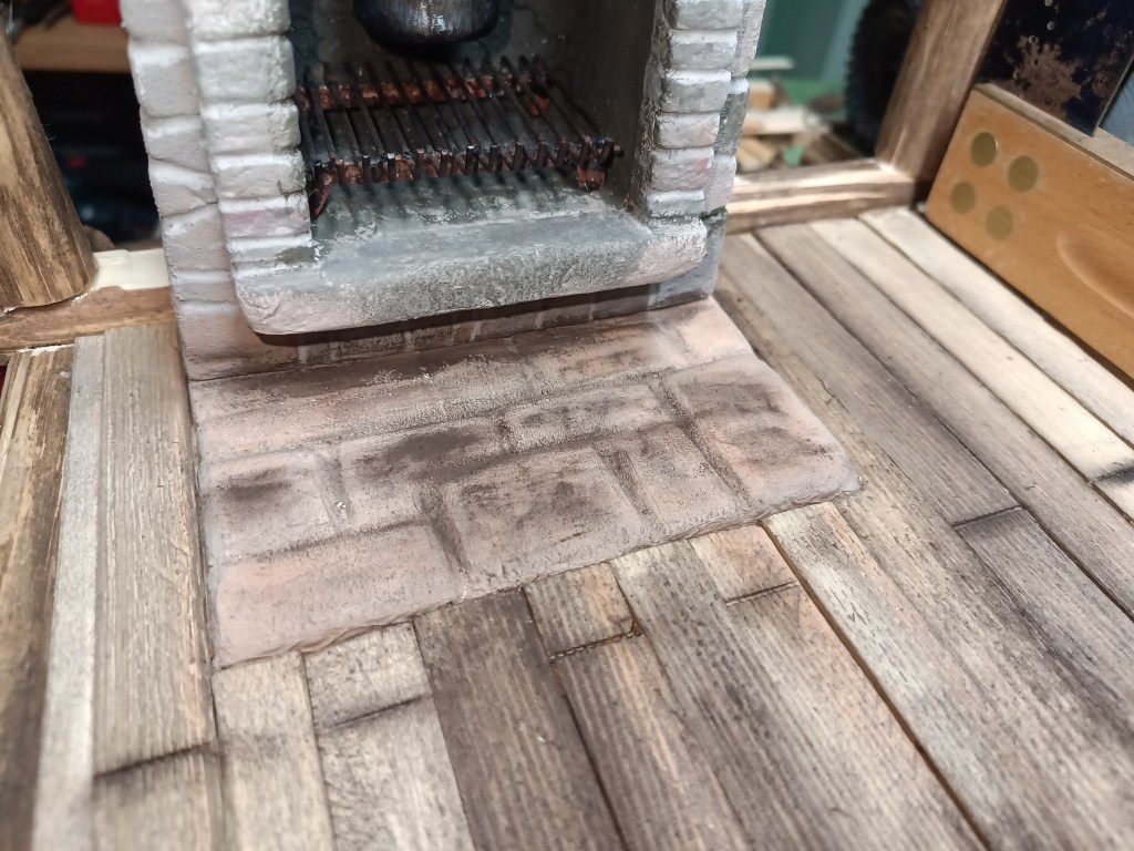 This was further optimized. The edges of the boards were blackened, some areas were lightened, and others were darkened even further. In the course of the floor design, the previously single-piece stone foundation was also cut, glued, and grouted.