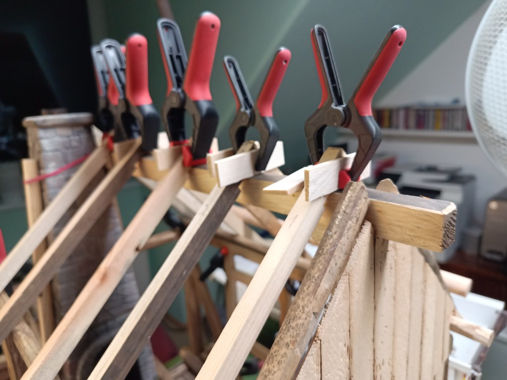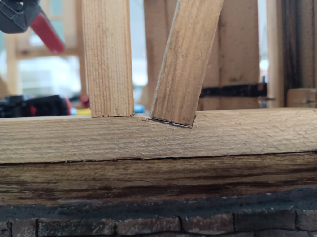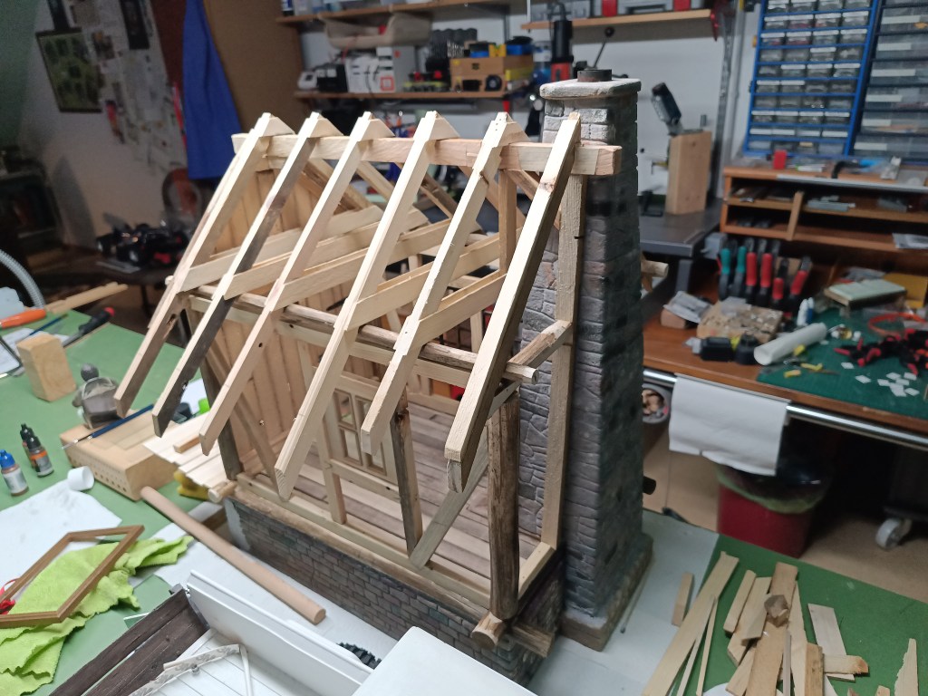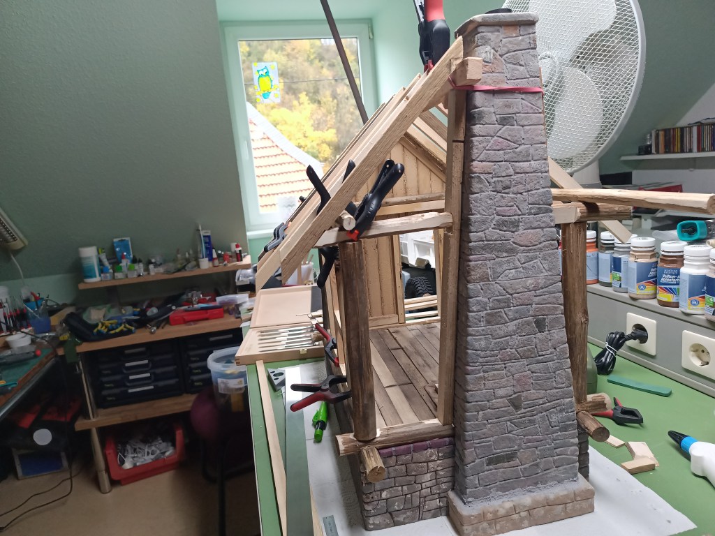 Einzig die linke Seitenwand fehlt jetzt noch, um das Fachwerk fertigzustellen. Am Dach fehlten auch noch einige Verstärkungen, deren Entstehung ich u.a. im aktuellen Beitrag vorstellen möchte. Meine Begeisterung beim Bauen ist derzeit kaum in Worte zu fassen. Daher geht es einfach sachlich weiter auf meiner Baustelle.
