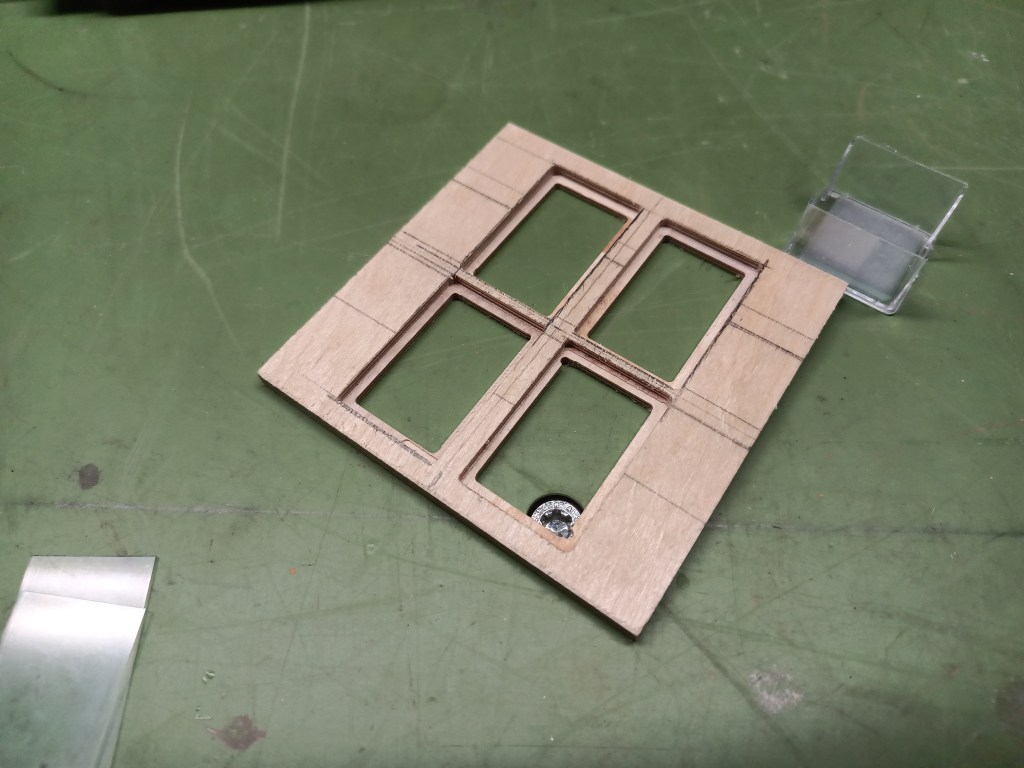 Auf der gegenüberliegenden Seite gibt es ein Holzfenster. Aus Sperrholz wurden 4 Felder ausgefräst. Zunächst für je 2 Mikroskop-Gläser von 22 mm Seitenlänge.