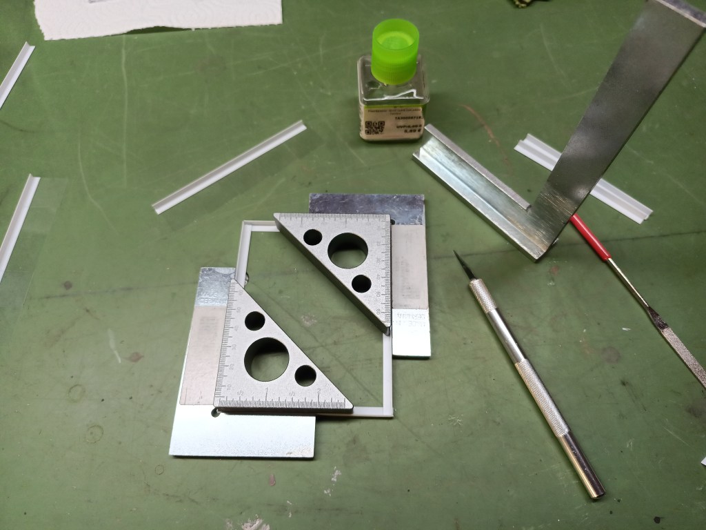 The industrial window frames were made from plastic angle profiles. In reality, a frame is also constructed there with angle and T-profiles.