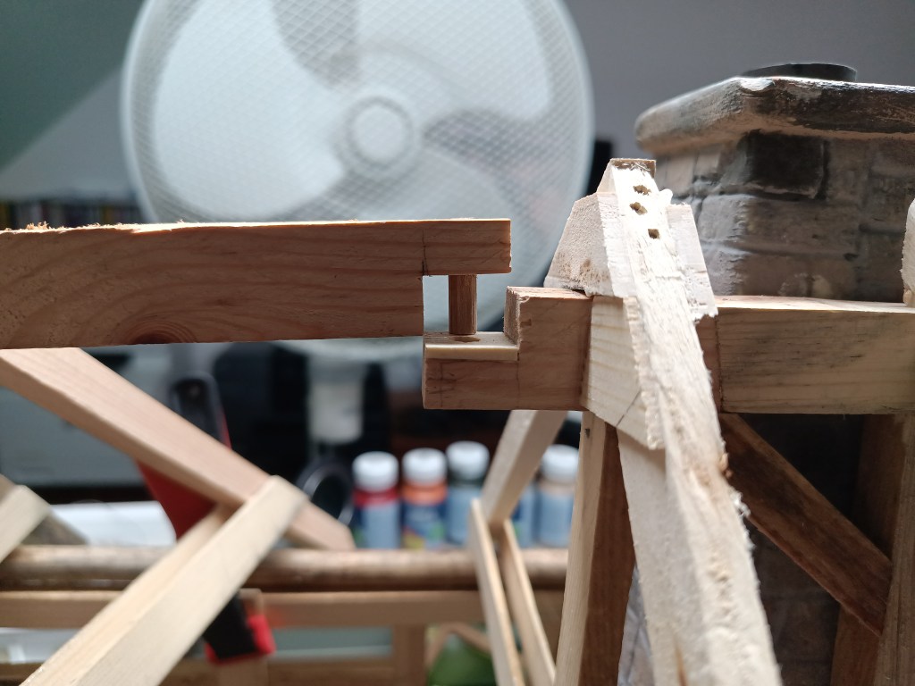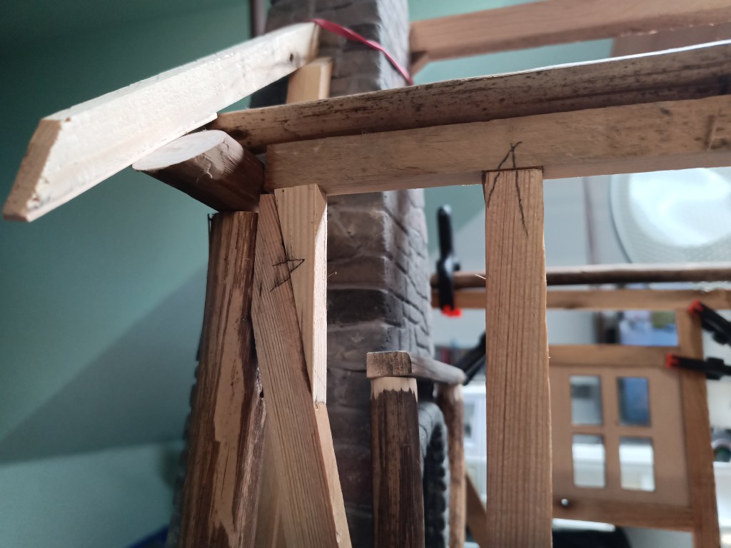 Now I am installing vertical, downward-protruding timbers on the lower rafter crossbars. This is to prevent the roof from shifting and also to prevent shear forces on the gable. Any forces that arise would act directly on the glued-on chimney and the two side support beams.
