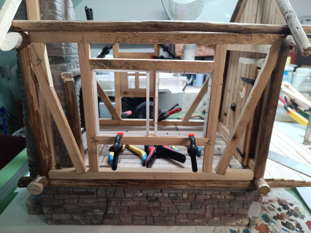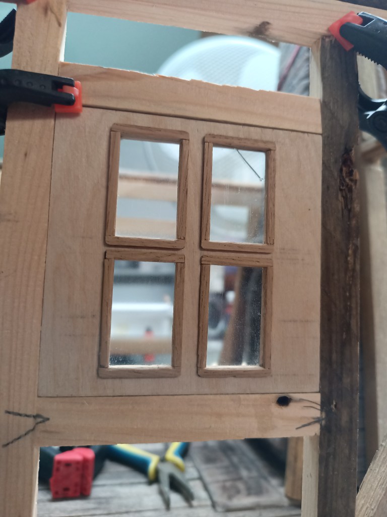Um die Fenster zu befestigen, habe ich eine Rückwand aus Sperrholz gesägt und für die Fenster je eine Aussparung eingefräst. Darin liegen die Fensterelemente lose und nach hinten fixiert. Vorne werden sie durch einen Rahmen aus Buchenholzleisten gesichert.