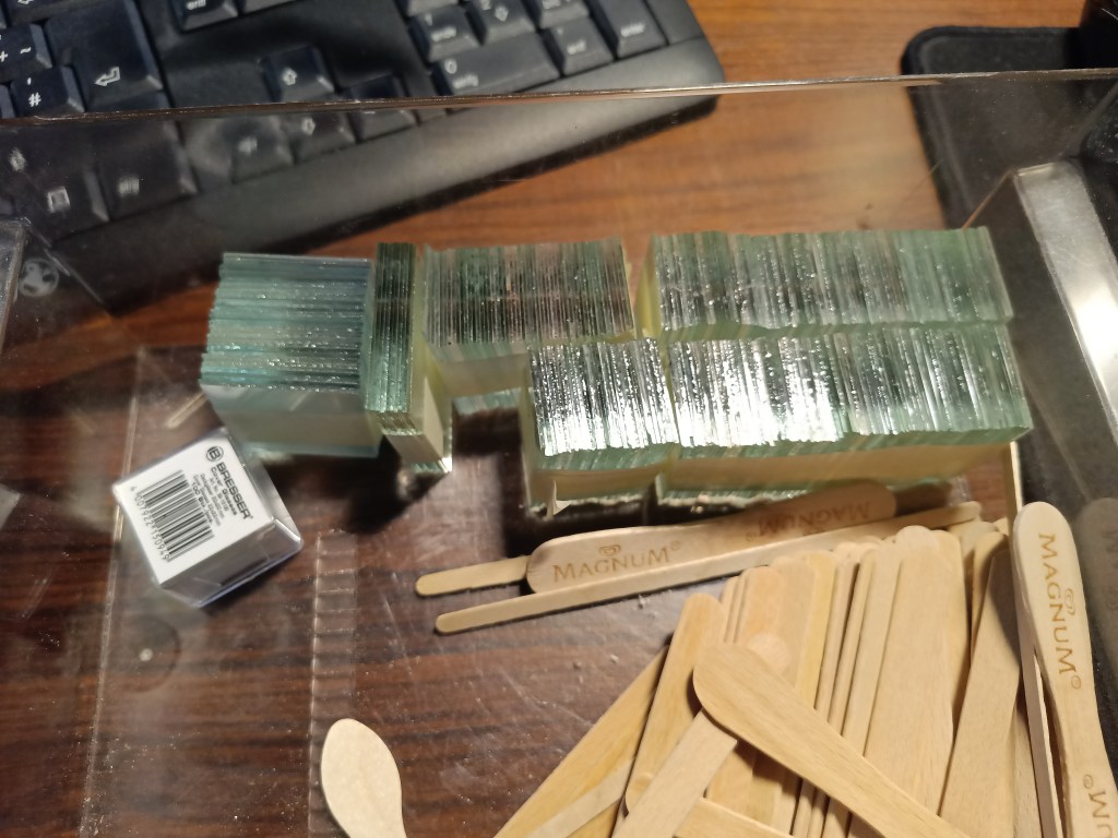 Schließlich doch auf die Maße von Glasscheibchen aus Dia-Rahmen geändert. Ein Forumskollege hatte mir einen netten Kontakt vermittelt, der die Gläschen nicht einfach in den Müll geworfen hat. So traf also einige Tage später, ein gut gefülltes Paket bei mir ein.